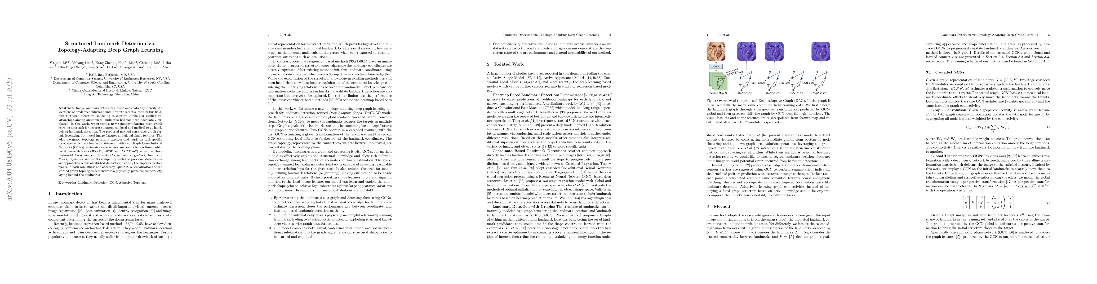 Image landmark detection aims to automatically identify the locations of predefined fiducial points. Despite recent success in this field, higher-ordered structural modeling to capture implicit or explicit relationships among anatomical landmarks has not been adequately exploited. In this work, we present a new topology-adapting deep graph learning approach for accurate anatomical facial and medical (e.g., hand, pelvis) landmark detection. The proposed method constructs graph signals leveraging both local image features and global shape features. The adaptive graph topology naturally explores and lands on task-specific structures which are learned end-to-end with two Graph Convolutional Networks (GCNs). Extensive experiments are conducted on three public facial image datasets (WFLW, 300W, and COFW-68) as well as three real-world X-ray medical datasets (Cephalometric (public), Hand and Pelvis). Quantitative results comparing with the previous state-of-the-art approaches across all studied datasets indicating the superior performance in both robustness and accuracy. Qualitative visualizations of the learned graph topologies demonstrate a physically plausible connectivity laying behind the landmarks.