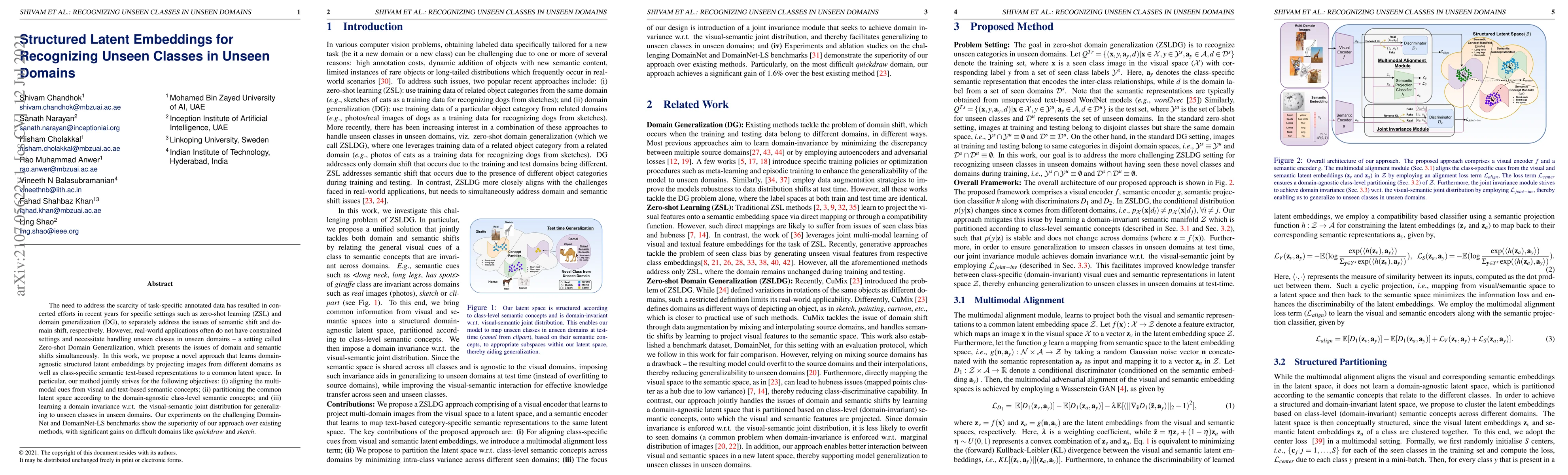 This paper proposes a novel method for zero-shot domain generalization by learning structured latent embeddings that align visual and text-based semantic representations in a common latent space, enabling recognition of unseen classes in unseen domains. The approach achieves domain invariance and outperforms existing methods on challenging benchmarks.