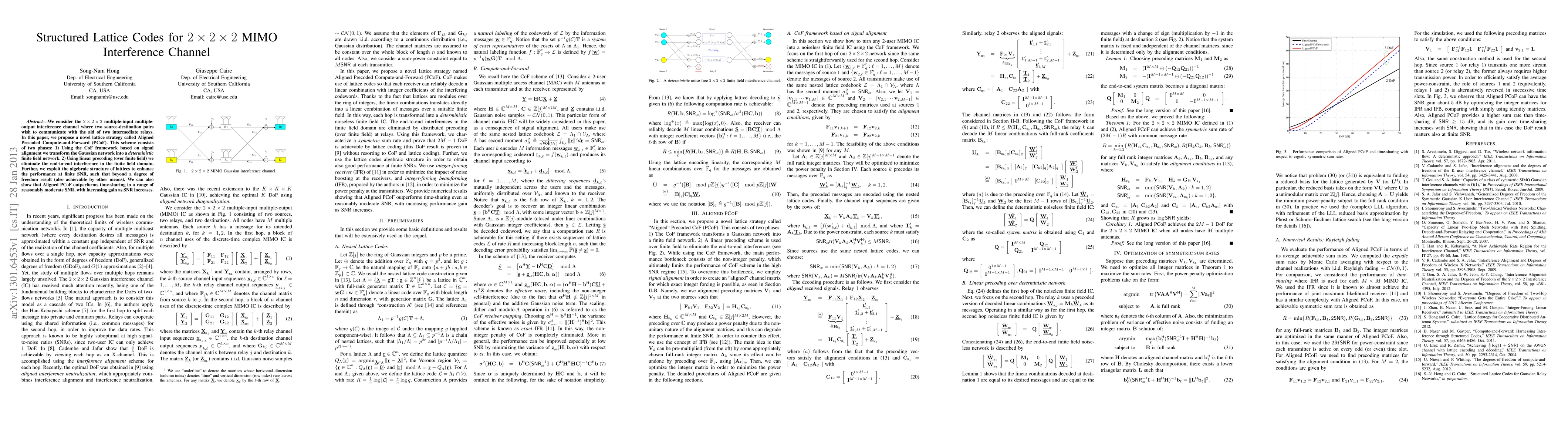 We consider the 2\times 2\times 2 multiple-input multipleoutput interference channel where two source-destination pairs wish to communicate with the aid of two intermediate relays. In this paper, we propose a novel lattice strategy called Aligned Precoded Compute-and-Forward (PCoF). This scheme consists of two phases: 1) Using the CoF framework based on signal alignment we transform the Gaussian network into a deterministic finite field network. 2) Using linear precoding (over finite field) we eliminate the end-to-end interference in the finite field domain. Further, we exploit the algebraic structure of lattices to enhance the performance at finite SNR, such that beyond a degree of freedom result (also achievable by other means). We can also show that Aligned PCoF outperforms time sharing in a range of reasonably moderate SNR, with increasing gain as SNR increases.