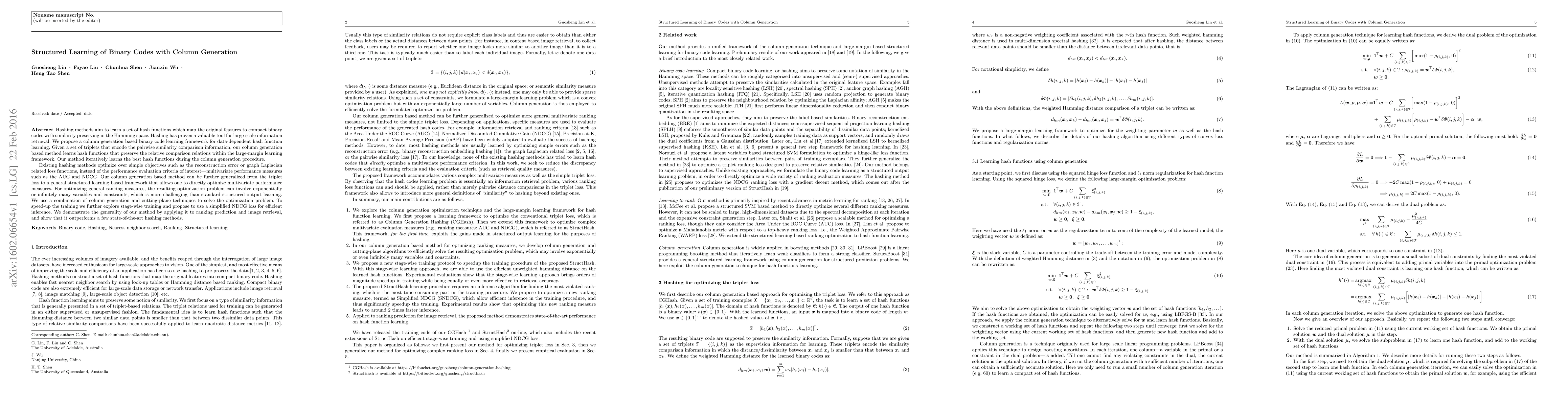 Hashing methods aim to learn a set of hash functions which map the original features to compact binary codes with similarity preserving in the Hamming space. Hashing has proven a valuable tool for large-scale information retrieval. We propose a column generation based binary code learning framework for data-dependent hash function learning. Given a set of triplets that encode the pairwise similarity comparison information, our column generation based method learns hash functions that preserve the relative comparison relations within the large-margin learning framework. Our method iteratively learns the best hash functions during the column generation procedure. Existing hashing methods optimize over simple objectives such as the reconstruction error or graph Laplacian related loss functions, instead of the performance evaluation criteria of interest---multivariate performance measures such as the AUC and NDCG. Our column generation based method can be further generalized from the triplet loss to a general structured learning based framework that allows one to directly optimize multivariate performance measures. For optimizing general ranking measures, the resulting optimization problem can involve exponentially or infinitely many variables and constraints, which is more challenging than standard structured output learning. We use a combination of column generation and cutting-plane techniques to solve the optimization problem. To speed-up the training we further explore stage-wise training and propose to use a simplified NDCG loss for efficient inference. We demonstrate the generality of our method by applying it to ranking prediction and image retrieval, and show that it outperforms a few state-of-the-art hashing methods.