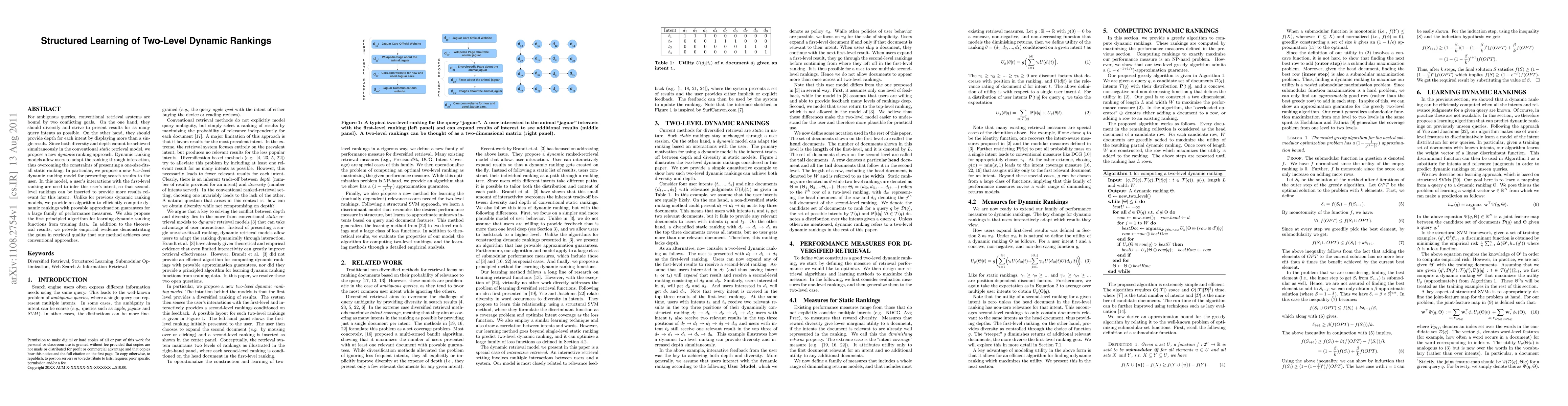For ambiguous queries, conventional retrieval systems are bound by two conflicting goals. On the one hand, they should diversify and strive to present results for as many query intents as possible. On the other hand, they should provide depth for each intent by displaying more than a single result. Since both diversity and depth cannot be achieved simultaneously in the conventional static retrieval model, we propose a new dynamic ranking approach. Dynamic ranking models allow users to adapt the ranking through interaction, thus overcoming the constraints of presenting a one-size-fits-all static ranking. In particular, we propose a new two-level dynamic ranking model for presenting search results to the user. In this model, a user's interactions with the first-level ranking are used to infer this user's intent, so that second-level rankings can be inserted to provide more results relevant for this intent. Unlike for previous dynamic ranking models, we provide an algorithm to efficiently compute dynamic rankings with provable approximation guarantees for a large family of performance measures. We also propose the first principled algorithm for learning dynamic ranking functions from training data. In addition to the theoretical results, we provide empirical evidence demonstrating the gains in retrieval quality that our method achieves over conventional approaches.
