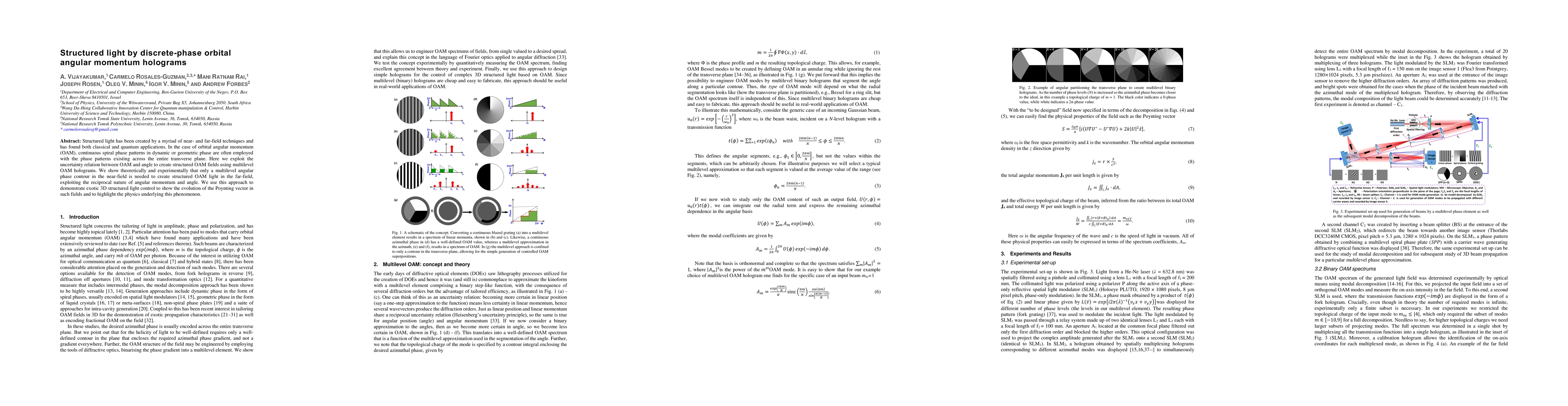 This paper presents a method to create structured light using discrete-phase orbital angular momentum (OAM) holograms, demonstrating that multilevel angular phase contours in the near-field can generate structured OAM fields in the far-field, showcasing 3D light control and the evolution of the Poynting vector. The approach leverages the reciprocal relationship between OAM and angle.