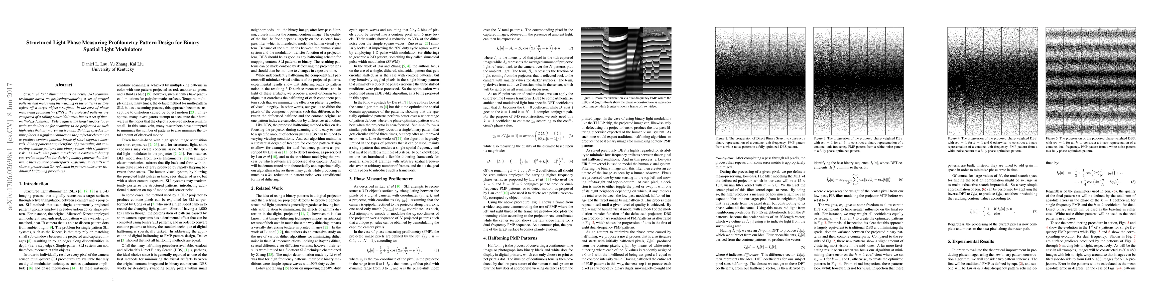 This paper proposes a contone-to-binary conversion algorithm for structured light phase measuring profilometry using binary spatial light modulators, achieving over three times less pattern noise compared to traditional halftoning methods. The method aims to maintain high-quality 3-D scanning despite the binary conversion.