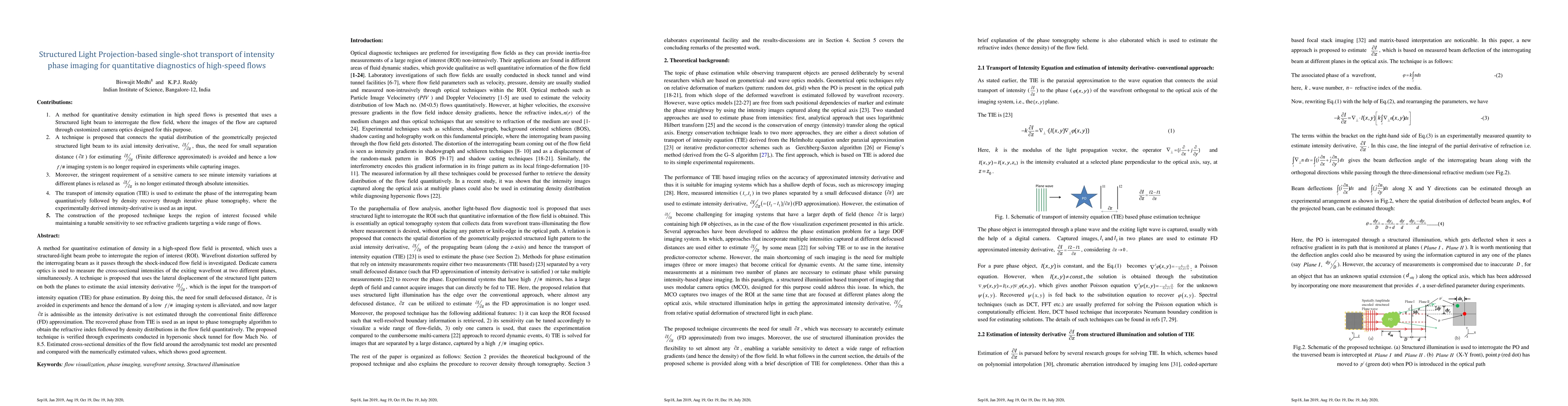 A method for quantitative estimation of density in a high-speed flow field is presented, which uses a structured-light beam probe to interrogate the region of interest (ROI). Wavefront distortion suffered by the interrogating beam as it passes through the shock-induced flow field is investigated. Dedicate camera optics is used to measure the cross-sectional intensities of the exiting wavefront at two different planes, simultaneously. A technique is proposed that uses the lateral displacement of the structured light pattern on both the planes to estimate the axial intensity derivative, dI/dz, which is the input for the transport-of intensity equation (TIE) for phase estimation. By doing this, the need for small defocused distance, dz is avoided in experiments and hence the demand for a low f/# imaging system is alleviated, and now larger dz is admissible as the intensity derivative is not estimated through the conventional finite difference (FD) approximation. The recovered phase from TIE is used as an input to phase tomography algorithm to obtain the refractive index followed by density distributions in the flow field quantitatively. The proposed technique is verified through experiments conducted in hypersonic shock tunnel for flow Mach No. of 8.5. Estimated cross-sectional densities of the flow field around the aerodynamic test model are presented and compared with the numerically estimated values, which shows good agreement.