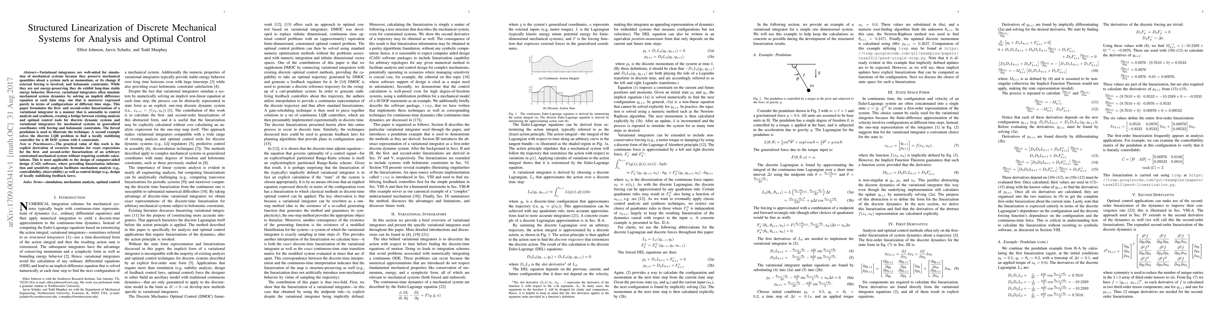 This paper develops first- and second-order linearizations of variational integrators to facilitate control analysis and synthesis for discrete mechanical systems, exemplified through a forced pendulum and a 40 DOF system with constraints. It bridges optimal control tools with variational integrators in generalized coordinates.