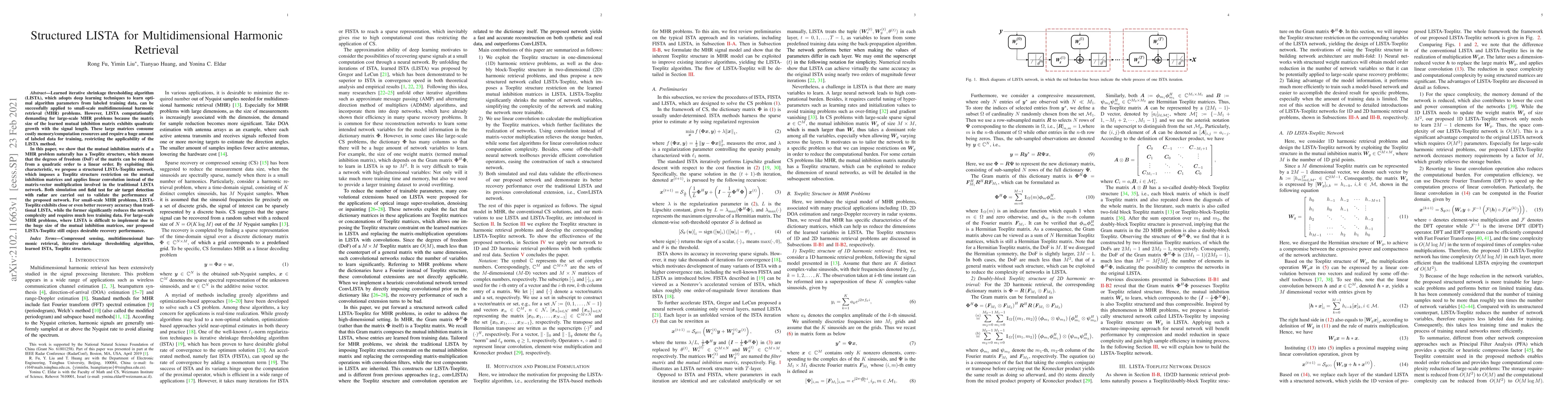 Learned iterative shrinkage thresholding algorithm (LISTA), which adopts deep learning techniques to learn optimal algorithm parameters from labeled training data, can be successfully applied to small-scale multidimensional harmonic retrieval (MHR) problems. However, LISTA computationally demanding for large-scale MHR problems because the matrix size of the learned mutual inhibition matrix exhibits quadratic growth with the signal length. These large matrices consume costly memory/computation resources and require a huge amount of labeled data for training, restricting the applicability of the LISTA method. In this paper, we show that the mutual inhibition matrix of a MHR problem naturally has a Toeplitz structure, which means that the degrees of freedom (DoF) of the matrix can be reduced from a quadratic order to a linear order. By exploiting this characteristic, we propose a structured LISTA-Toeplitz network, which imposes a Toeplitz structure restriction on the mutual inhibition matrices and applies linear convolution instead of the matrix-vector multiplication involved in the traditional LISTA network. Both simulation and field test for air target detection with radar are carried out to validate the performance of the proposed network. For small-scale MHR problems, LISTAToeplitz exhibits close or even better recovery accuracy than traditional LISTA, while the former significantly reduces the network complexity and requires much less training data. For large-scale MHR problems, where LISTA is difficult to implement due to the huge size of the mutual inhibition matrices, our proposed LISTA-Toeplitz still enjoys desirable recovery performance.