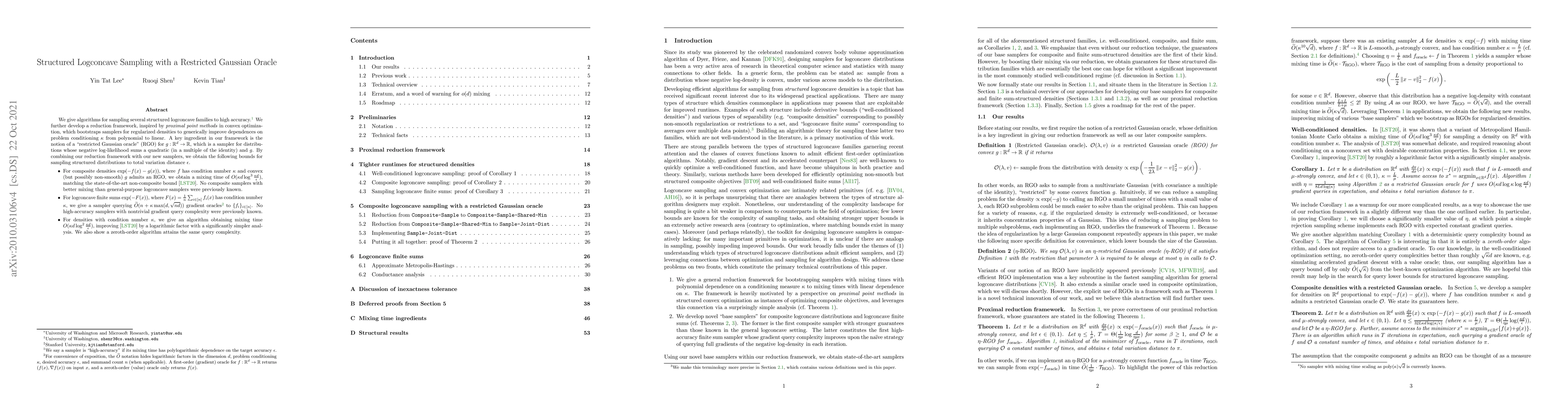 We give algorithms for sampling several structured logconcave families to high accuracy. We further develop a reduction framework, inspired by proximal point methods in convex optimization, which bootstraps samplers for regularized densities to improve dependences on problem conditioning. A key ingredient in our framework is the notion of a "restricted Gaussian oracle" (RGO) for $g: \mathbb{R}^d \rightarrow \mathbb{R}$, which is a sampler for distributions whose negative log-likelihood sums a quadratic and $g$. By combining our reduction framework with our new samplers, we obtain the following bounds for sampling structured distributions to total variation distance $\epsilon$. For composite densities $\exp(-f(x) - g(x))$, where $f$ has condition number $\kappa$ and convex (but possibly non-smooth) $g$ admits an RGO, we obtain a mixing time of $O(\kappa d \log^3\frac{\kappa d}{\epsilon})$, matching the state-of-the-art non-composite bound; no composite samplers with better mixing than general-purpose logconcave samplers were previously known. For logconcave finite sums $\exp(-F(x))$, where $F(x) = \frac{1}{n}\sum_{i \in [n]} f_i(x)$ has condition number $\kappa$, we give a sampler querying $\widetilde{O}(n + \kappa\max(d, \sqrt{nd}))$ gradient oracles to $\{f_i\}_{i \in [n]}$; no high-accuracy samplers with nontrivial gradient query complexity were previously known. For densities with condition number $\kappa$, we give an algorithm obtaining mixing time $O(\kappa d \log^2\frac{\kappa d}{\epsilon})$, improving the prior state-of-the-art by a logarithmic factor with a significantly simpler analysis; we also show a zeroth-order algorithm attains the same query complexity.