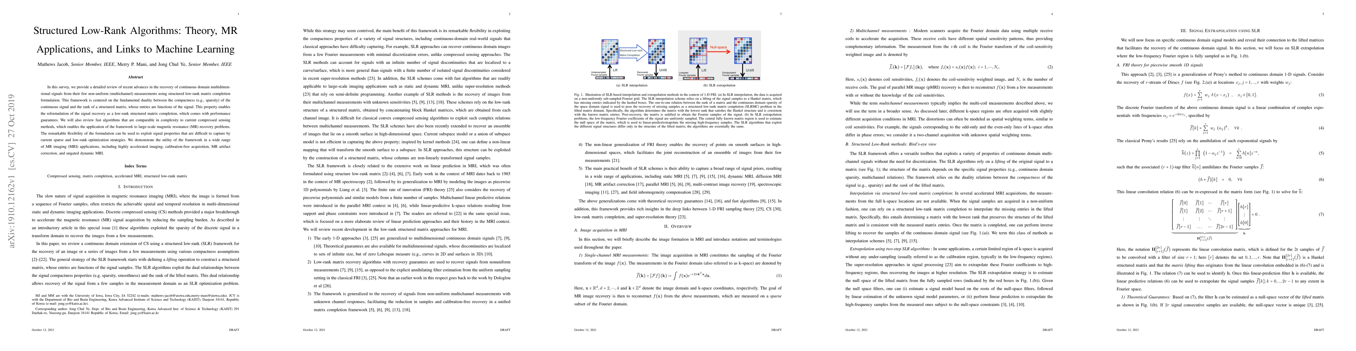 In this survey, we provide a detailed review of recent advances in the recovery of continuous domain multidimensional signals from their few non-uniform (multichannel) measurements using structured low-rank matrix completion formulation. This framework is centered on the fundamental duality between the compactness (e.g., sparsity) of the continuous signal and the rank of a structured matrix, whose entries are functions of the signal. This property enables the reformulation of the signal recovery as a low-rank structured matrix completion, which comes with performance guarantees. We will also review fast algorithms that are comparable in complexity to current compressed sensing methods, which enables the application of the framework to large-scale magnetic resonance (MR) recovery problems. The remarkable flexibility of the formulation can be used to exploit signal properties that are difficult to capture by current sparse and low-rank optimization strategies. We demonstrate the utility of the framework in a wide range of MR imaging (MRI) applications, including highly accelerated imaging, calibration-free acquisition, MR artifact correction, and ungated dynamic MRI.