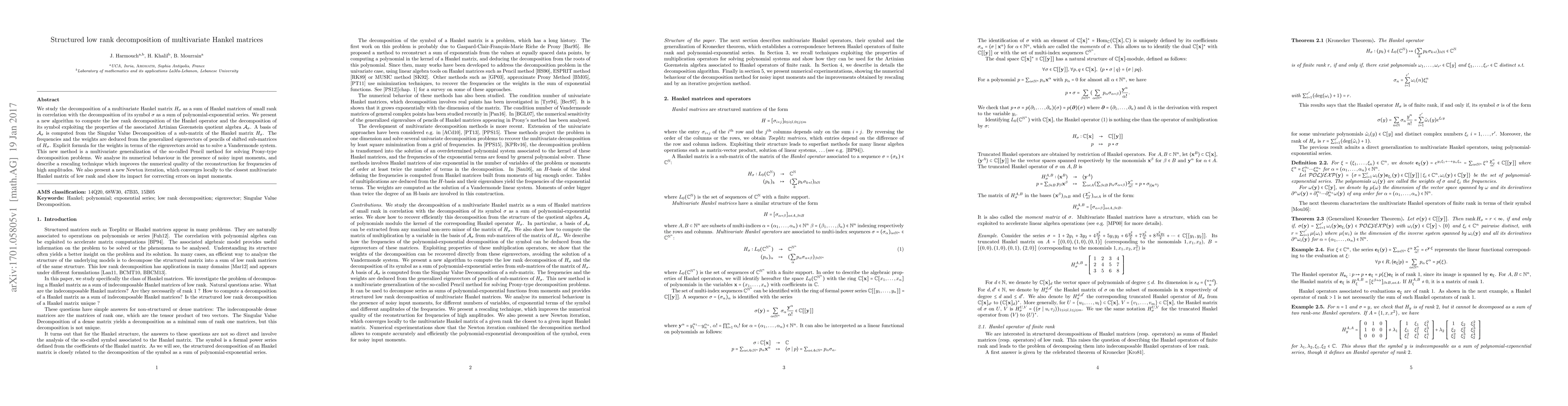 We study the decomposition of a multivariate Hankel matrix H\_$\sigma$ as a sum of Hankel matrices of small rank in correlation with the decomposition of its symbol $\sigma$ as a sum of polynomial-exponential series. We present a new algorithm to compute the low rank decomposition of the Hankel operator and the decomposition of its symbol exploiting the properties of the associated Artinian Gorenstein quotient algebra A\_$\sigma$. A basis of A\_$\sigma$ is computed from the Singular Value Decomposition of a sub-matrix of the Hankel matrix H\_$\sigma$. The frequencies and the weights are deduced from the generalized eigenvectors of pencils of shifted sub-matrices of H $\sigma$. Explicit formula for the weights in terms of the eigenvectors avoid us to solve a Vandermonde system. This new method is a multivariate generalization of the so-called Pencil method for solving Prony-type decomposition problems. We analyse its numerical behaviour in the presence of noisy input moments, and describe a rescaling technique which improves the numerical quality of the reconstruction for frequencies of high amplitudes. We also present a new Newton iteration, which converges locally to the closest multivariate Hankel matrix of low rank and show its impact for correcting errors on input moments.