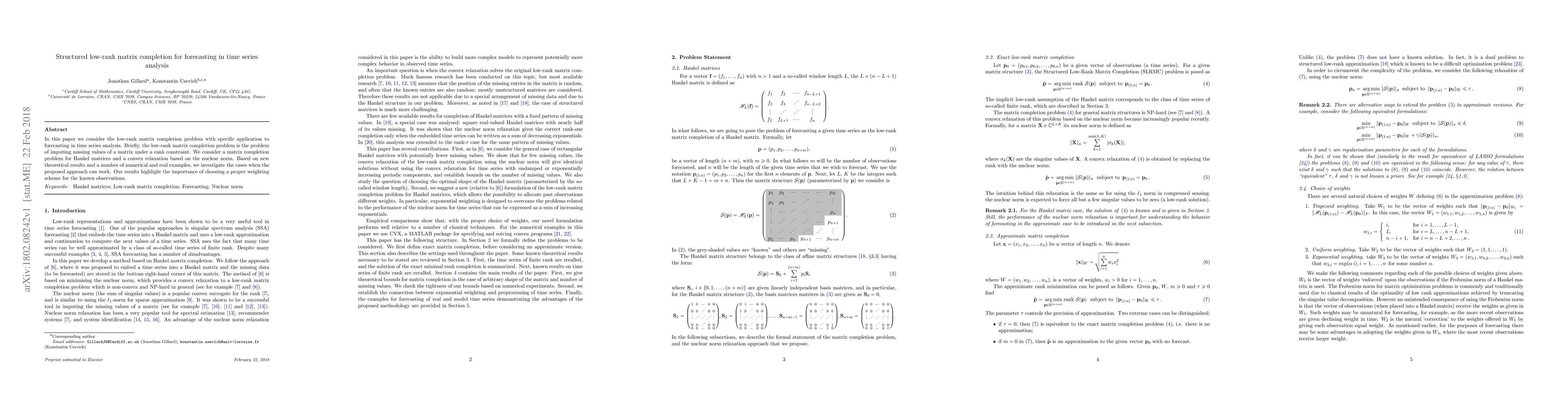 This paper addresses the low-rank matrix completion problem for forecasting in time series analysis, focusing on Hankel matrices and the nuclear norm for convex relaxation. It emphasizes the importance of an appropriate weighting scheme for known observations to achieve effective imputation and forecasting.