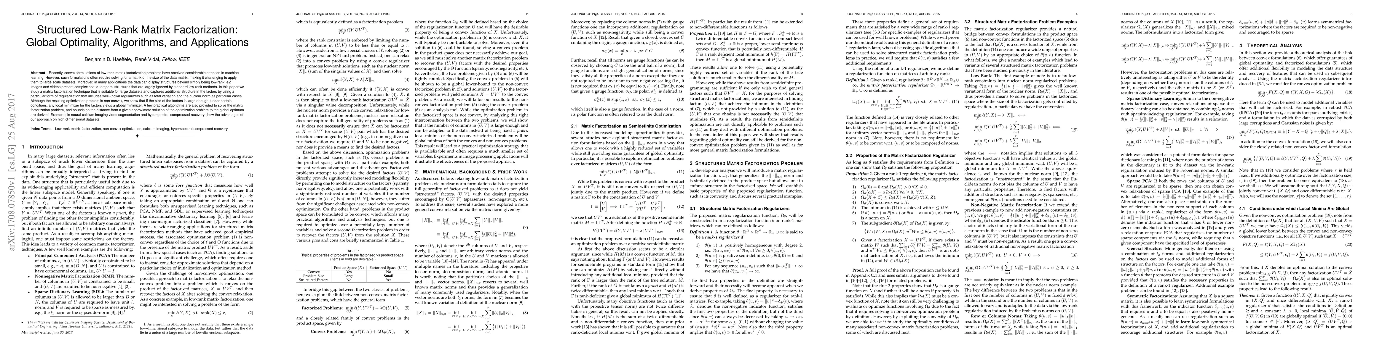 This paper proposes a structured low-rank matrix factorization technique that accommodates large datasets and captures additional data structures like spatio-temporal patterns. It demonstrates global optimality under certain conditions and provides practical algorithms for solving the non-convex optimization problem, showcasing its effectiveness in applications such as video segmentation and hyperspectral data recovery.