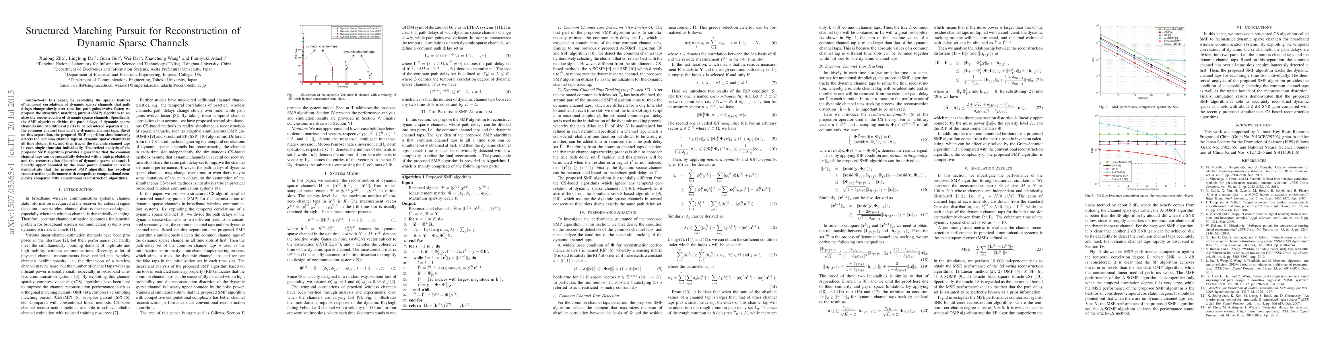 The paper proposes a structured matching pursuit (SMP) algorithm to reconstruct dynamic sparse channels by exploiting temporal correlations. The SMP algorithm separately detects common and dynamic channel taps, ensuring high detection probability and bounded reconstruction distortion. Simulation results show superior performance and competitive complexity.