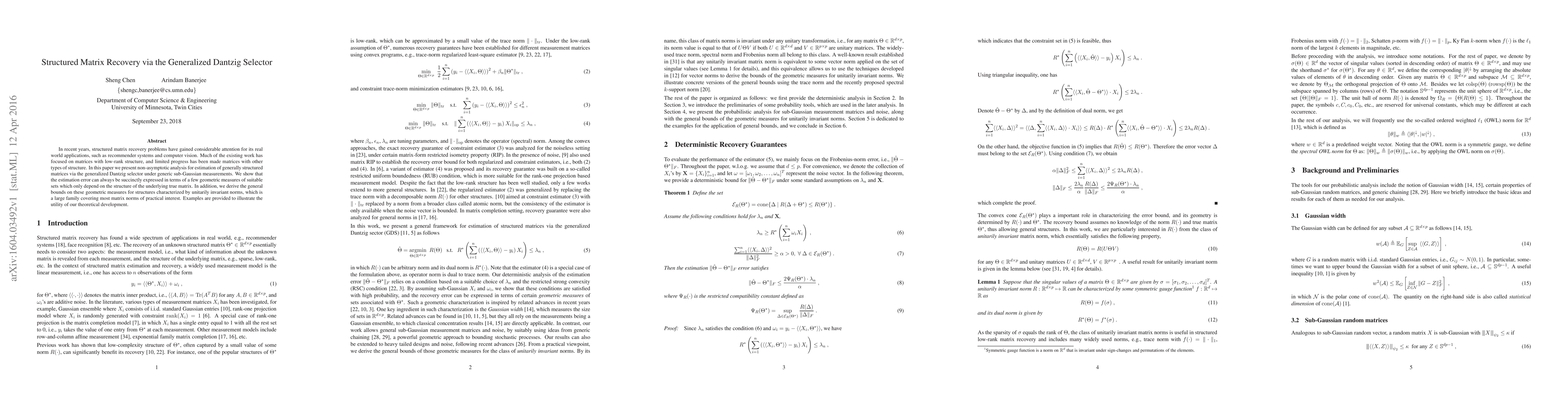 In recent years, structured matrix recovery problems have gained considerable attention for its real world applications, such as recommender systems and computer vision. Much of the existing work has focused on matrices with low-rank structure, and limited progress has been made matrices with other types of structure. In this paper we present non-asymptotic analysis for estimation of generally structured matrices via the generalized Dantzig selector under generic sub-Gaussian measurements. We show that the estimation error can always be succinctly expressed in terms of a few geometric measures of suitable sets which only depend on the structure of the underlying true matrix. In addition, we derive the general bounds on these geometric measures for structures characterized by unitarily invariant norms, which is a large family covering most matrix norms of practical interest. Examples are provided to illustrate the utility of our theoretical development.