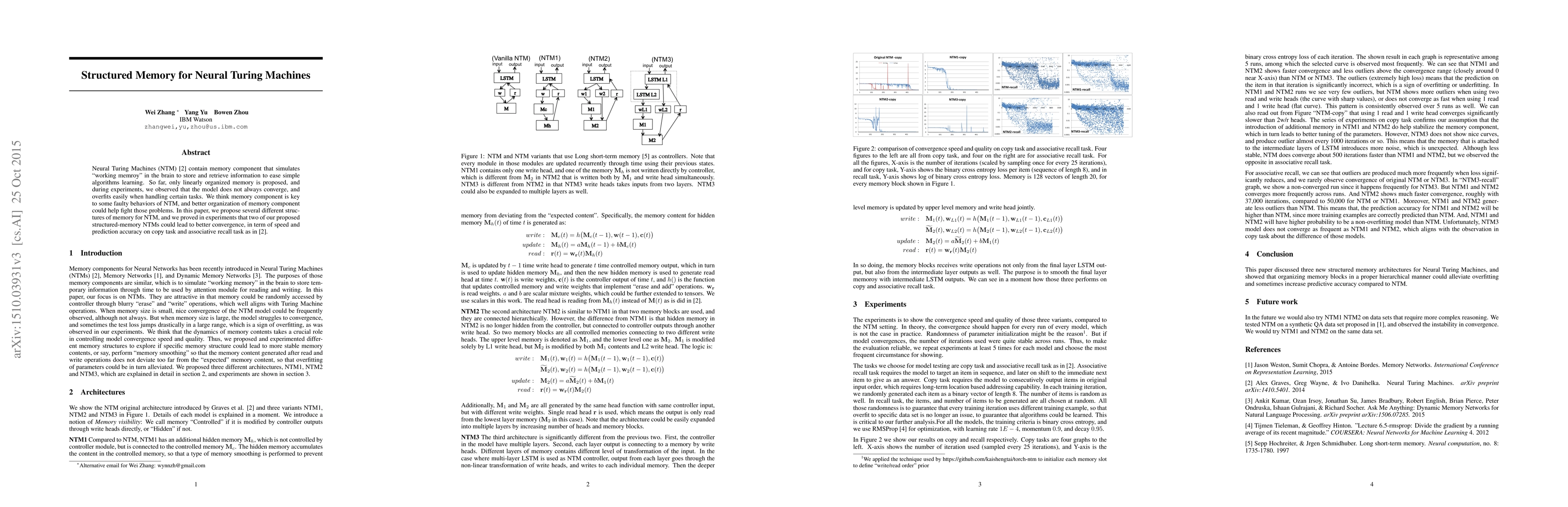 This paper proposes new memory structures for Neural Turing Machines to improve convergence and reduce overfitting. Experiments show that two structured-memory NTMs outperform the traditional linear memory in terms of speed and accuracy on copy and associative recall tasks.