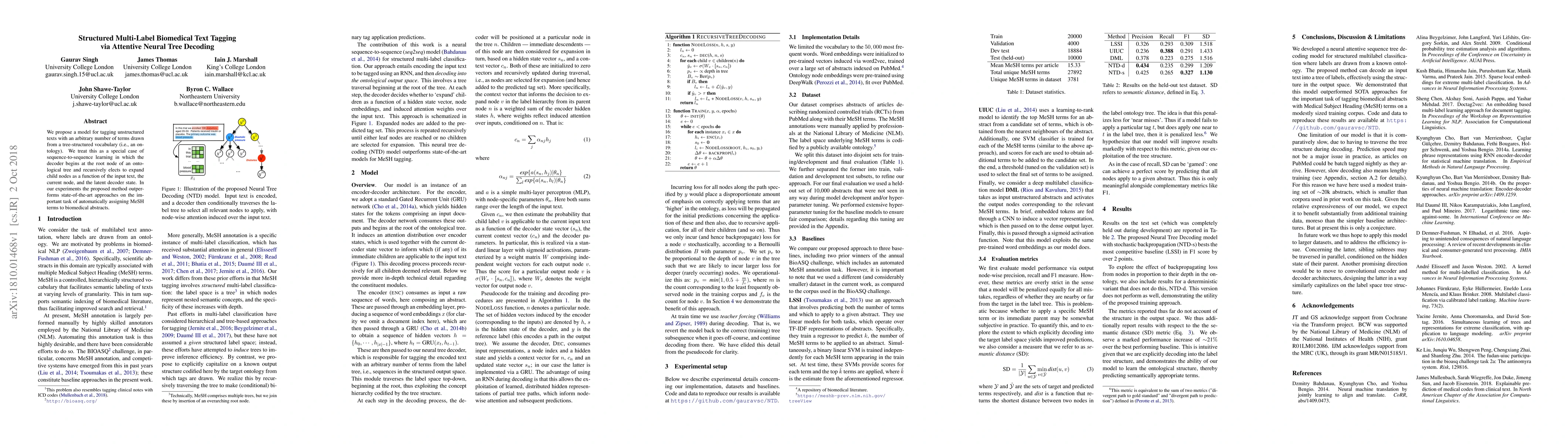 The paper introduces a novel model for tagging unstructured biomedical texts with multiple terms from a tree-structured vocabulary (ontology) using attentive neural tree decoding. This method surpasses existing approaches in assigning MeSH terms to biomedical abstracts, demonstrating superior performance in automatic text classification for biomedical research.