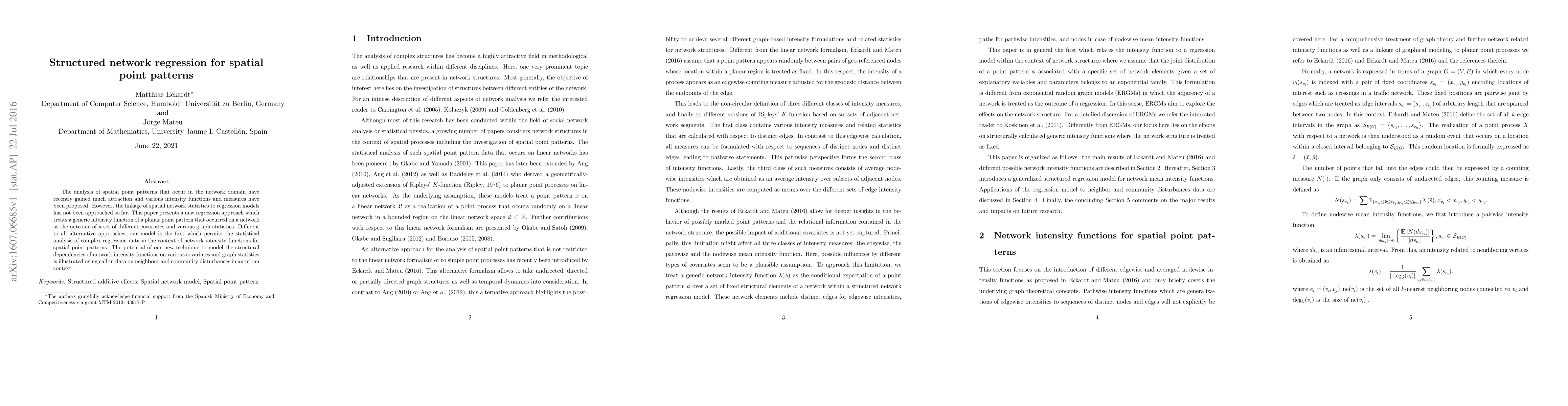 This paper introduces a novel structured network regression approach to analyze spatial point patterns on networks, linking network statistics to regression models for the first time. The proposed model enables statistical analysis of complex regression data in the context of network intensity functions, demonstrated through urban call-in data on disturbances.