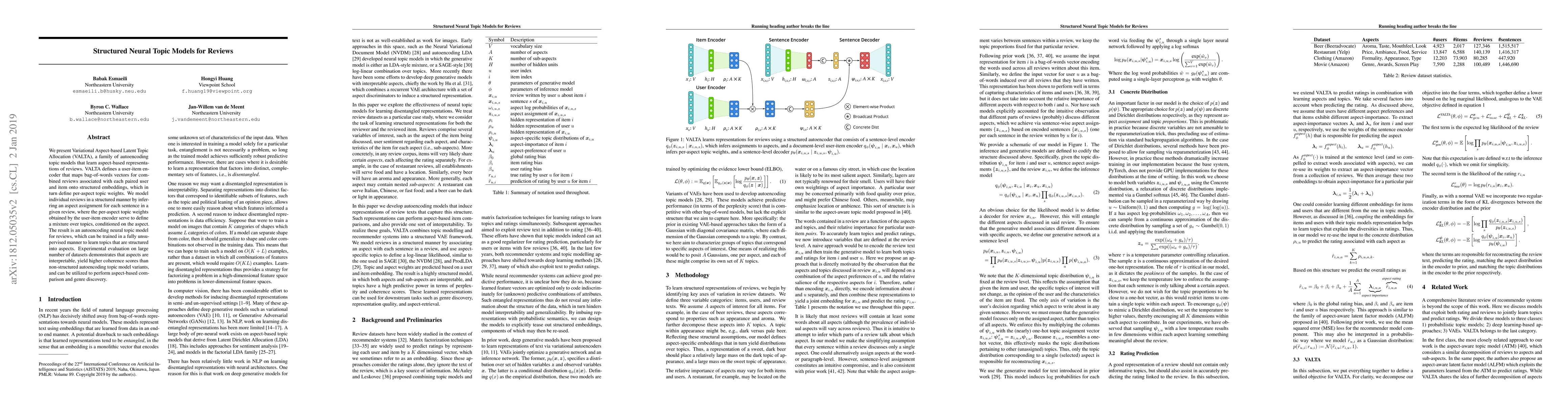 This paper introduces VALTA, a neural topic model that learns aspect-based representations of reviews through autoencoding. It maps user-item reviews to structured embeddings, enabling interpretable aspect-based topic modeling and superior coherence compared to non-structured models.