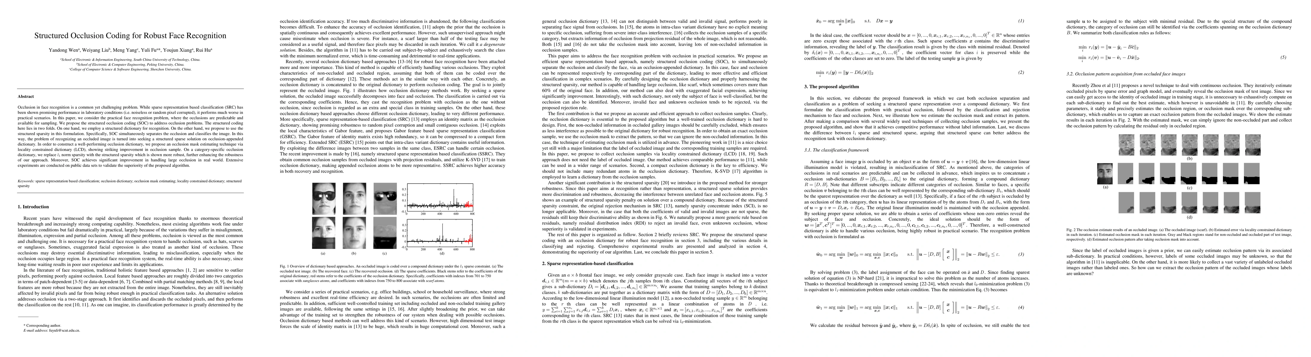 This paper proposes structured occlusion coding (SOC) to tackle the challenge of face recognition under predictable occlusions. SOC leverages a structured dictionary and structured sparsity to simultaneously separate occlusions and classify images, significantly improving performance in practical scenarios.