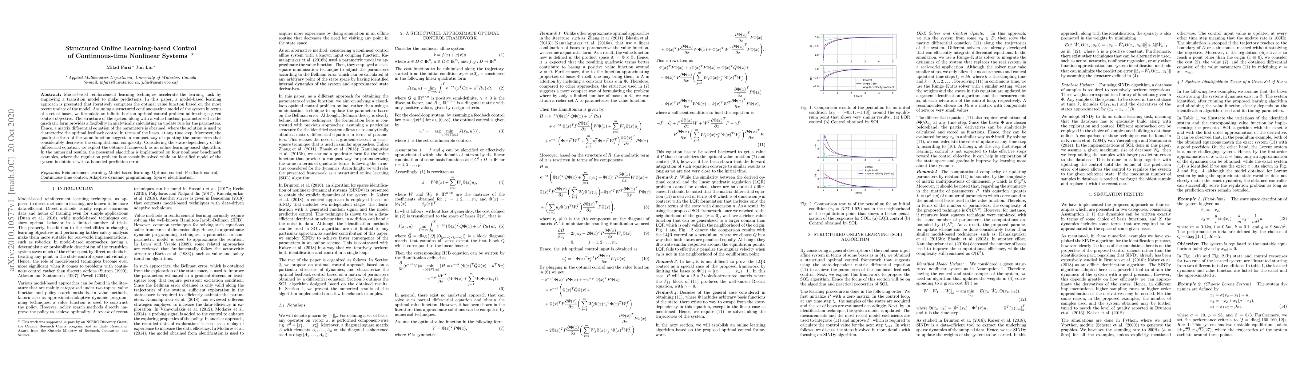 Model-based reinforcement learning techniques accelerate the learning task by employing a transition model to make predictions. In this paper, a model-based learning approach is presented that iteratively computes the optimal value function based on the most recent update of the model. Assuming a structured continuous-time model of the system in terms of a set of bases, we formulate an infinite horizon optimal control problem addressing a given control objective. The structure of the system along with a value function parameterized in the quadratic form provides a flexibility in analytically calculating an update rule for the parameters. Hence, a matrix differential equation of the parameters is obtained, where the solution is used to characterize the optimal feedback control in terms of the bases, at any time step. Moreover, the quadratic form of the value function suggests a compact way of updating the parameters that considerably decreases the computational complexity. Considering the state-dependency of the differential equation, we exploit the obtained framework as an online learning-based algorithm. In the numerical results, the presented algorithm is implemented on four nonlinear benchmark examples, where the regulation problem is successfully solved while an identified model of the system is obtained with a bounded prediction error.