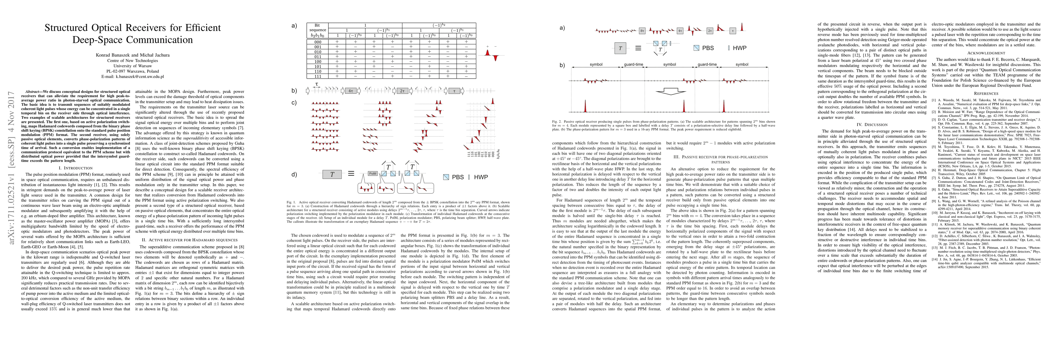 This paper proposes structured optical receivers to improve deep-space communication efficiency by reducing the need for high peak-to-average power ratios. It introduces two scalable architectures: one using active polarization switching and Hadamard codewords, and another using passive optical elements to convert phase-polarization patterns into a single pulse.