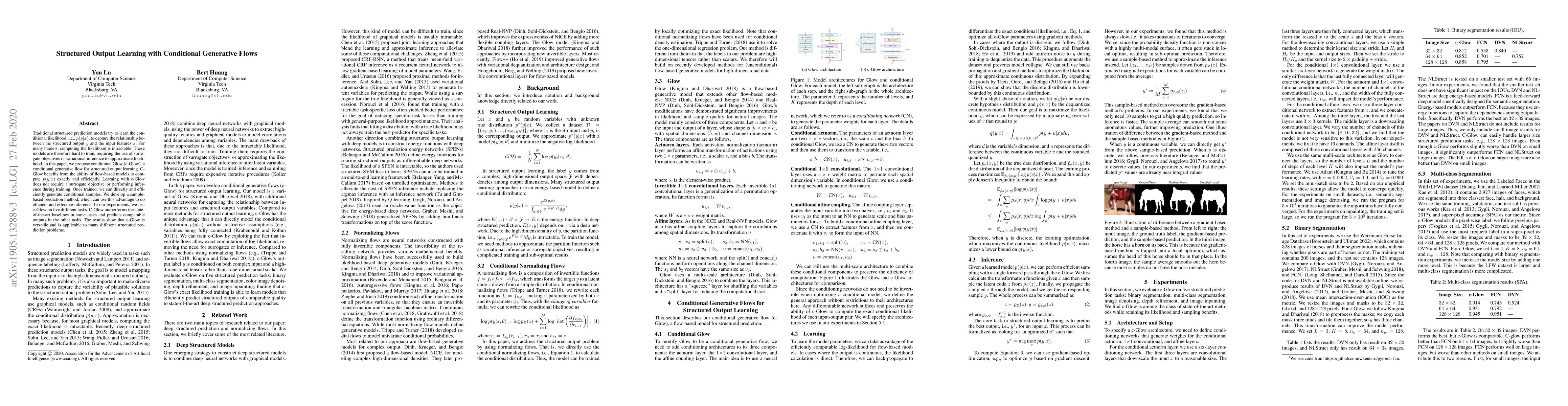 This paper introduces conditional Glow (c-Glow), a generative flow model for structured output learning that computes conditional likelihoods exactly, eliminating the need for surrogate objectives. Experiments show c-Glow outperforms or matches state-of-the-art methods across various structured prediction tasks.