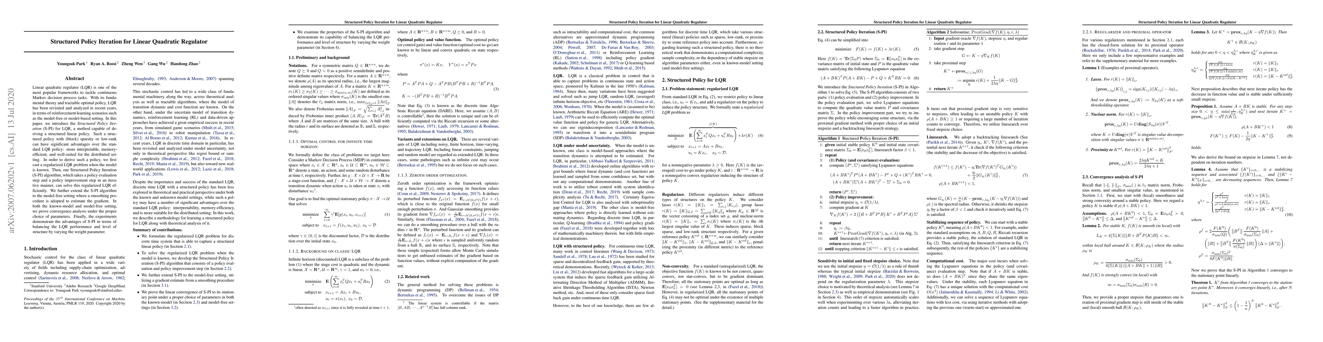 Structured Policy Iteration with Linesearch for Linear Quadratic Regulators
