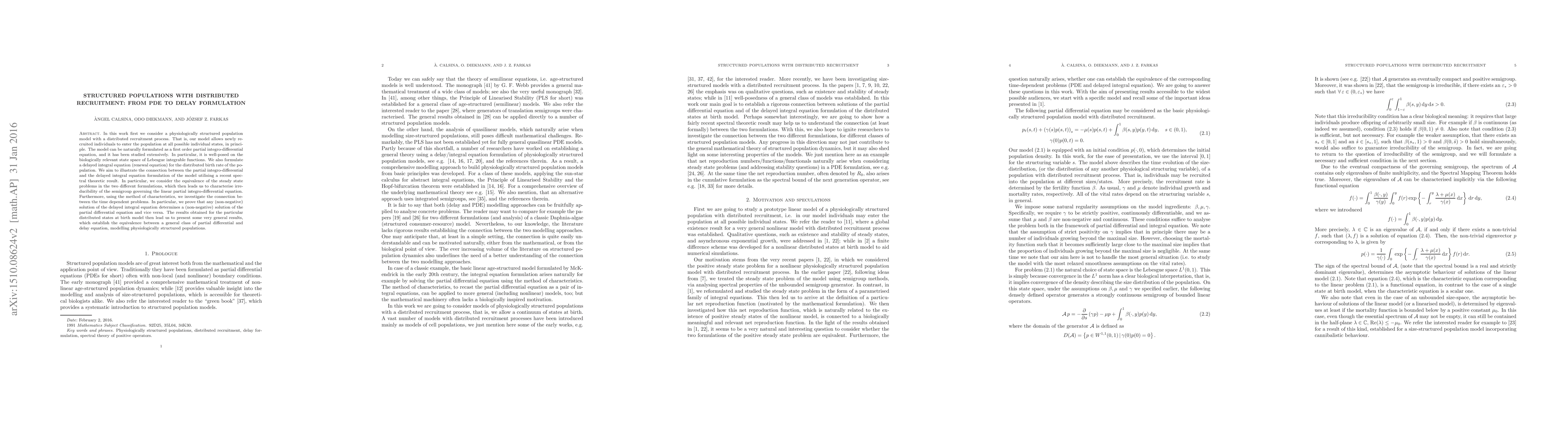 This paper explores a physiologically structured population model with distributed recruitment, formulated as a first-order partial integro-differential equation. It establishes a connection between this PDE and a delayed integral equation formulation, proving their equivalence in steady-state and time-dependent problems, and generalizing the results to a broader class of population models.