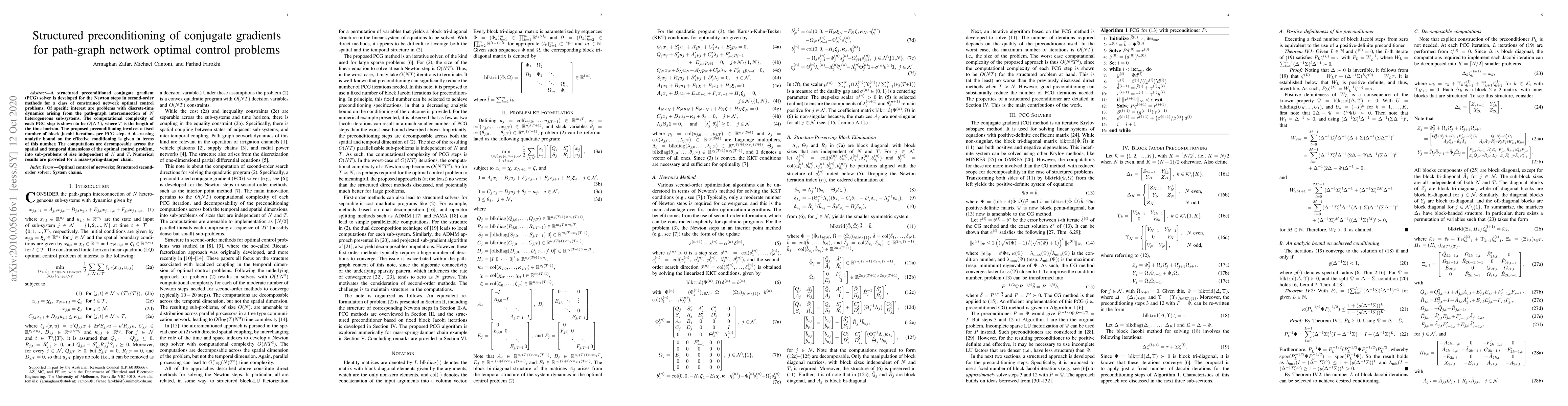 A structured preconditioned conjugate gradient (PCG) solver is developed for the Newton steps in second-order methods for a class of constrained network optimal control problems. Of specific interest are problems with discrete-time dynamics arising from the path-graph interconnection of $N$ heterogeneous sub-systems. The computational complexity of each PGC step is shown to be $O(NT)$, where $T$ is the length of the time horizon. The proposed preconditioning involves a fixed number of block Jacobi iterations per PCG step. A decreasing analytic bound on the effective conditioning is given in terms of this number. The computations are decomposable across the spatial and temporal dimensions of the optimal control problem, into sub-problems of size independent of $N$ and $T$. Numerical results are provided for a mass-spring-damper chain.