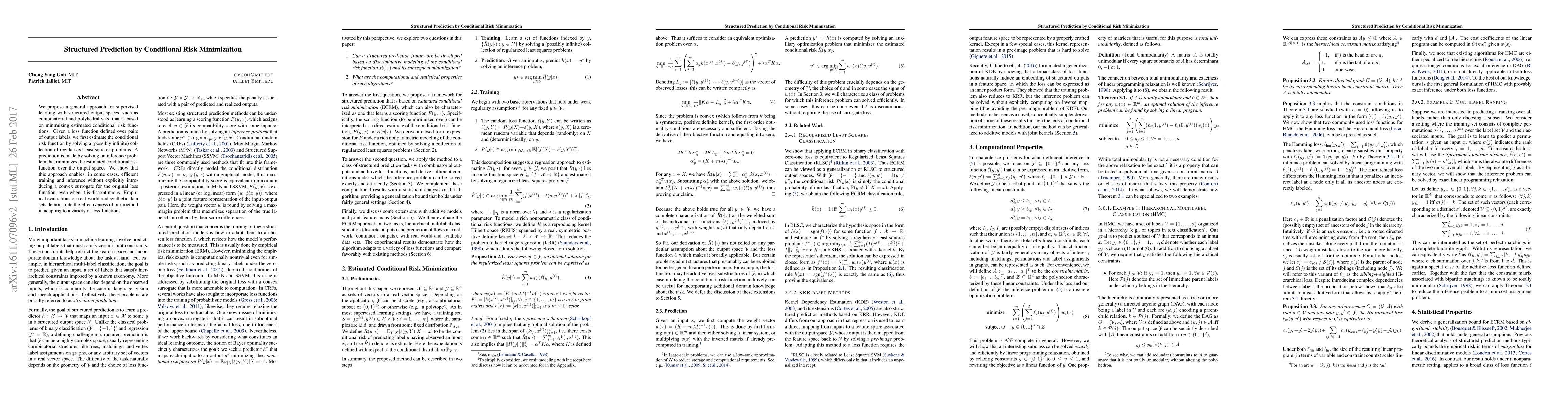 This paper introduces a supervised learning method for structured output spaces by minimizing estimated conditional risk functions, achieving efficient training and inference without requiring convex surrogates for discontinuous losses. Empirical results show the method's effectiveness across various loss functions.