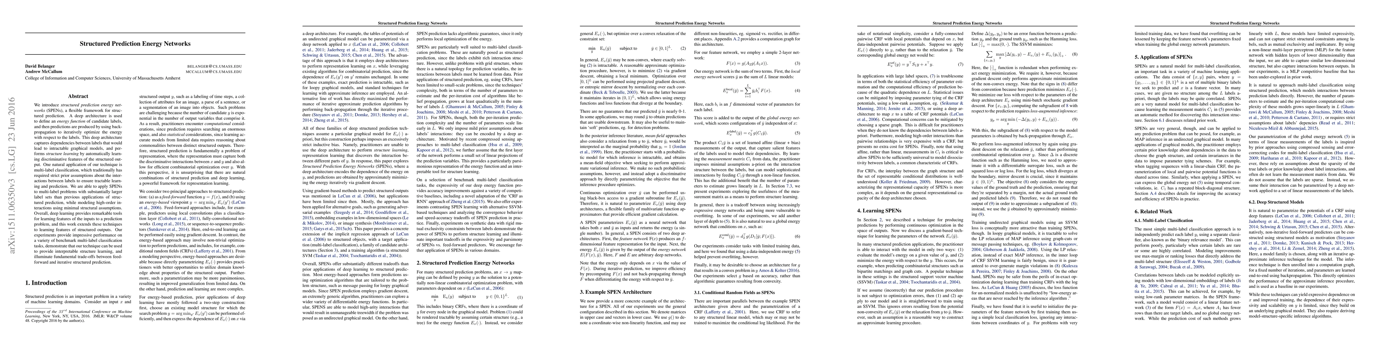 The paper introduces structured prediction energy networks (SPENs) for flexible structured prediction, leveraging deep architectures to define energy functions and optimize predictions iteratively. This approach enables modeling high-order interactions in multi-label classification without strict prior assumptions, achieving impressive performance on benchmark tasks.