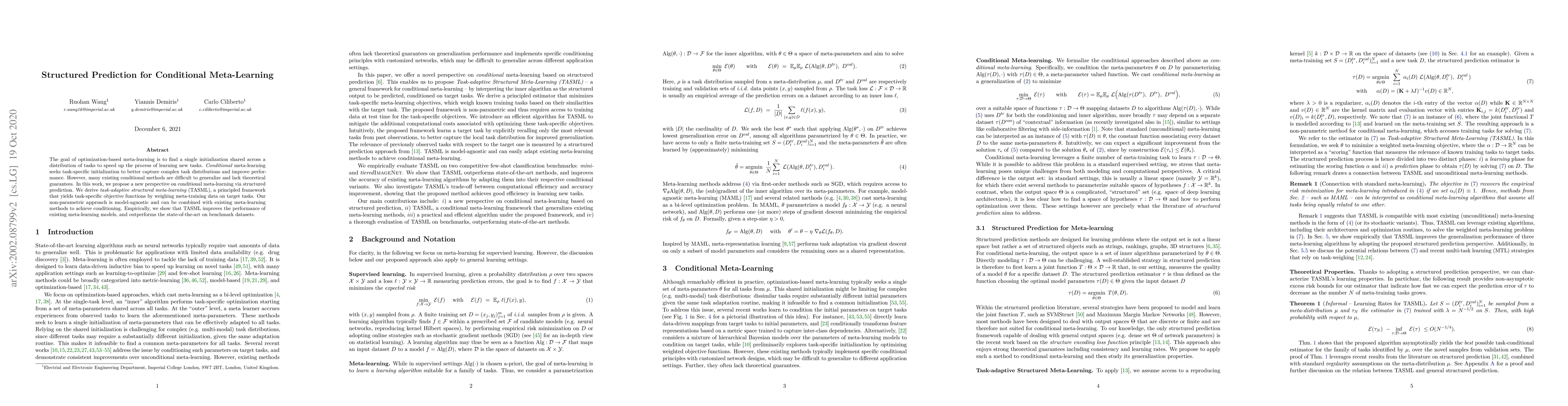 This paper introduces a novel framework, task-adaptive structured meta-learning (TASML), for conditional meta-learning, which aims to generate task-specific initializations to enhance performance. The proposed method, which is model-agnostic and combines with existing meta-learning techniques, shows improved performance over state-of-the-art methods on benchmark datasets.