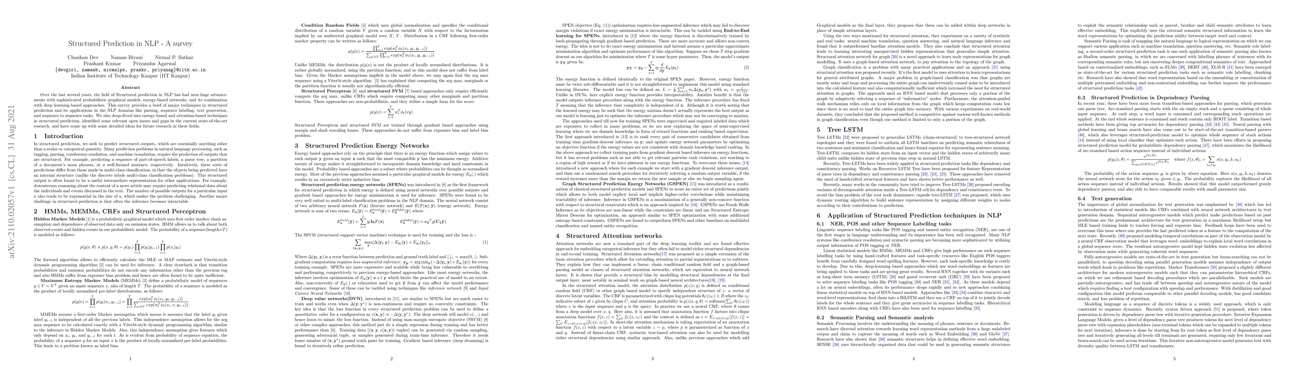 Over the last several years, the field of Structured prediction in NLP has had seen huge advancements with sophisticated probabilistic graphical models, energy-based networks, and its combination with deep learning-based approaches. This survey provides a brief of major techniques in structured prediction and its applications in the NLP domains like parsing, sequence labeling, text generation, and sequence to sequence tasks. We also deep-dived into energy-based and attention-based techniques in structured prediction, identified some relevant open issues and gaps in the current state-of-the-art research, and have come up with some detailed ideas for future research in these fields.