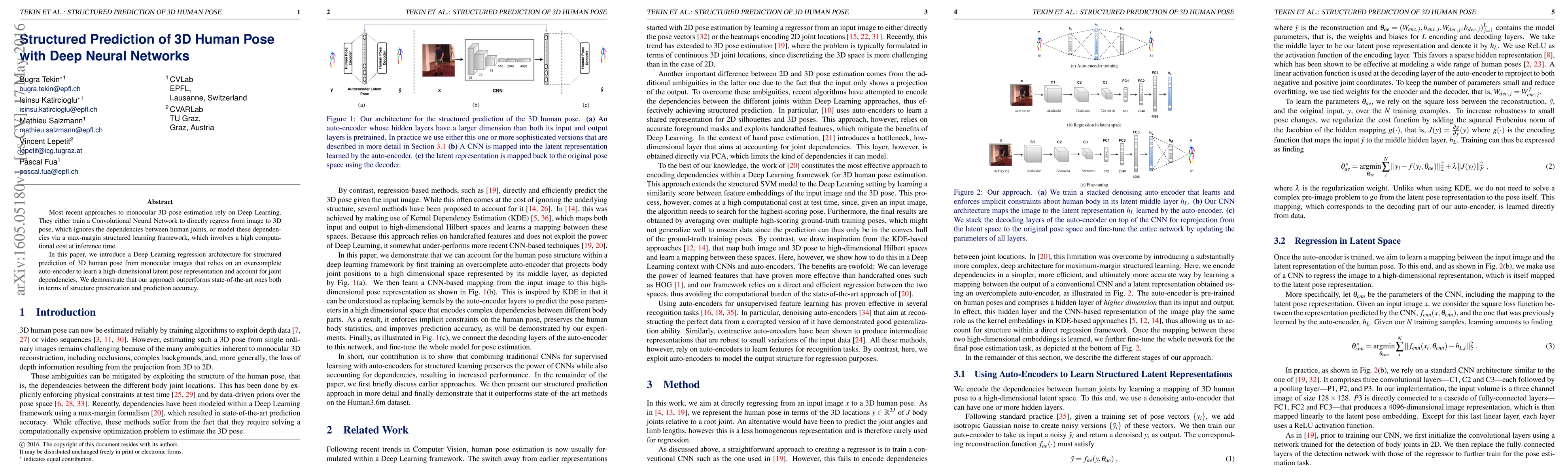 Most recent approaches to monocular 3D pose estimation rely on Deep Learning. They either train a Convolutional Neural Network to directly regress from image to 3D pose, which ignores the dependencies between human joints, or model these dependencies via a max-margin structured learning framework, which involves a high computational cost at inference time. In this paper, we introduce a Deep Learning regression architecture for structured prediction of 3D human pose from monocular images that relies on an overcomplete auto-encoder to learn a high-dimensional latent pose representation and account for joint dependencies. We demonstrate that our approach outperforms state-of-the-art ones both in terms of structure preservation and prediction accuracy.