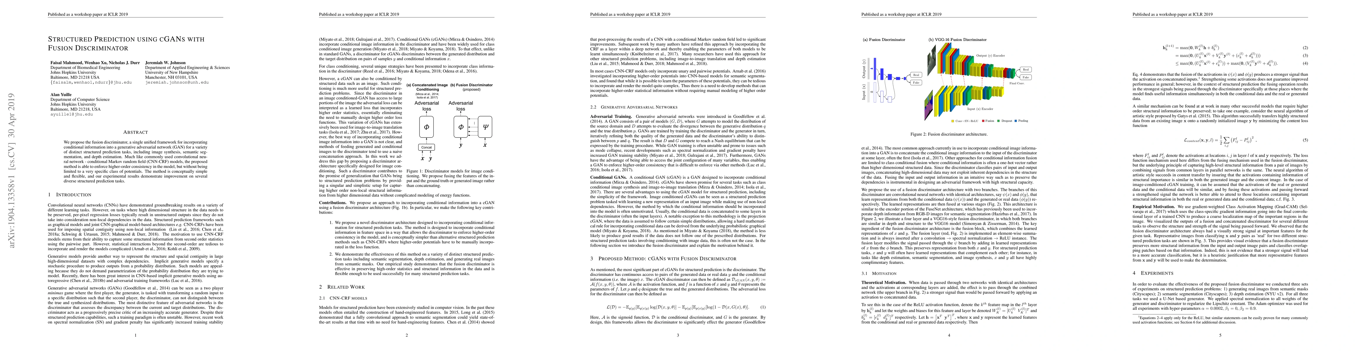 This research introduces the 'fusion discriminator' for Generative Adversarial Networks (GANs), enabling the integration of conditional information for various structured prediction tasks like image synthesis, semantic segmentation, and depth estimation. The method outperforms traditional CNN-CRF models by enforcing higher-order consistency without specific potential limitations.