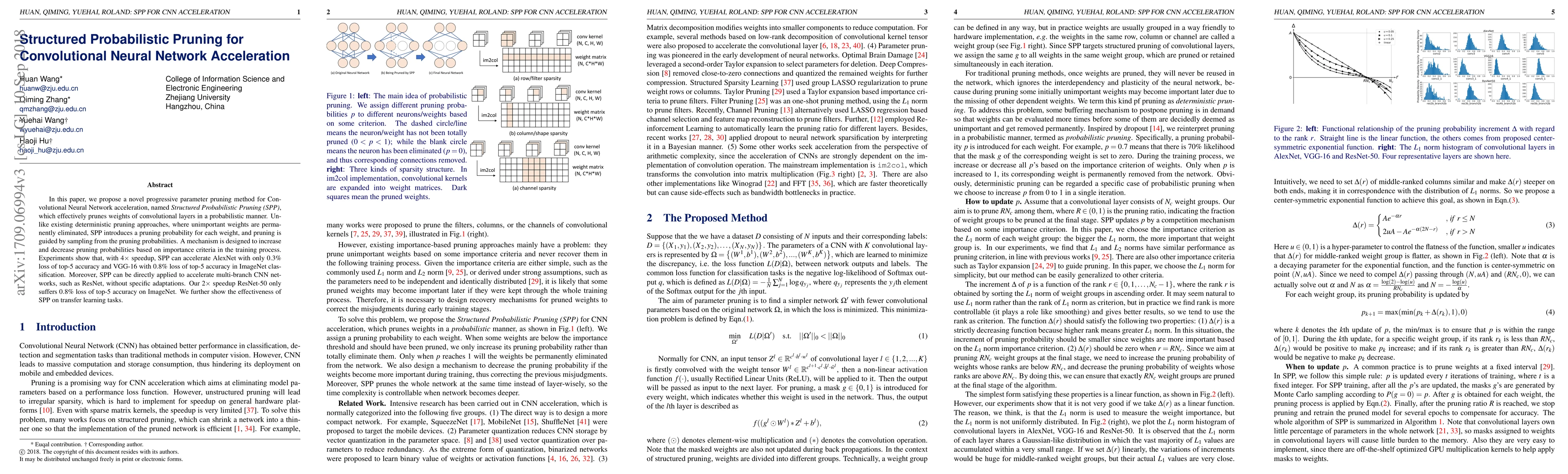 This paper introduces Structured Probabilistic Pruning (SPP), a novel method for accelerating Convolutional Neural Networks by progressively pruning weights in a probabilistic manner. Unlike deterministic approaches, SPP assigns a pruning probability to each weight, dynamically adjusting these probabilities during training to maintain accuracy. Experiments demonstrate SPP achieves significant speedups with minimal loss in accuracy for networks like AlexNet, VGG-16, and ResNet-50.