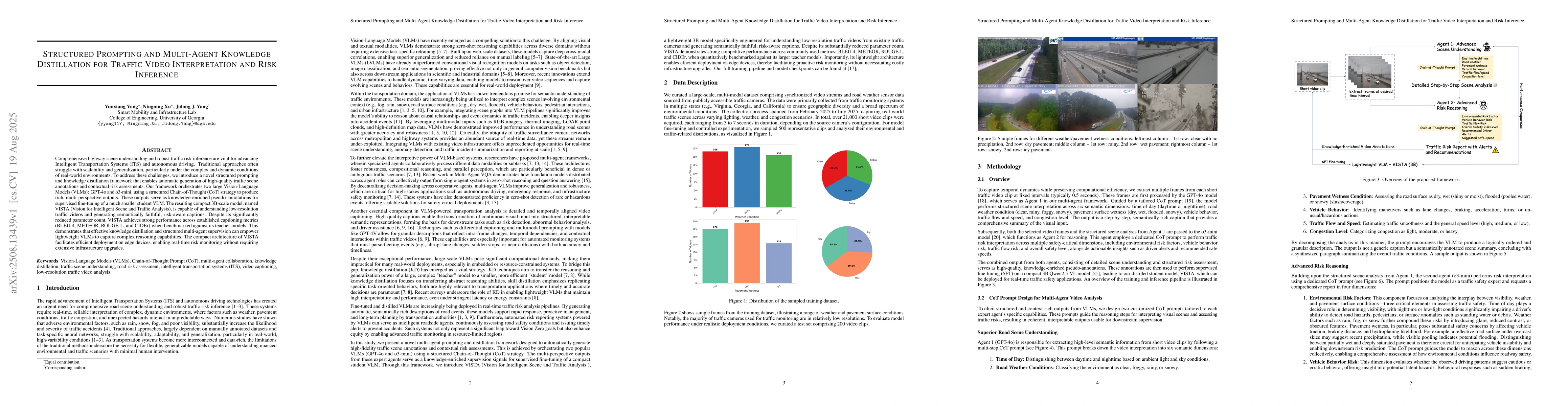 Comprehensive highway scene understanding and robust traffic risk inference are vital for advancing Intelligent Transportation Systems (ITS) and autonomous driving. Traditional approaches often struggle with scalability and generalization, particularly under the complex and dynamic conditions of real-world environments. To address these challenges, we introduce a novel structured prompting and knowledge distillation framework that enables automatic generation of high-quality traffic scene annotations and contextual risk assessments. Our framework orchestrates two large Vision-Language Models (VLMs): GPT-4o and o3-mini, using a structured Chain-of-Thought (CoT) strategy to produce rich, multi-perspective outputs. These outputs serve as knowledge-enriched pseudo-annotations for supervised fine-tuning of a much smaller student VLM. The resulting compact 3B-scale model, named VISTA (Vision for Intelligent Scene and Traffic Analysis), is capable of understanding low-resolution traffic videos and generating semantically faithful, risk-aware captions. Despite its significantly reduced parameter count, VISTA achieves strong performance across established captioning metrics (BLEU-4, METEOR, ROUGE-L, and CIDEr) when benchmarked against its teacher models. This demonstrates that effective knowledge distillation and structured multi-agent supervision can empower lightweight VLMs to capture complex reasoning capabilities. The compact architecture of VISTA facilitates efficient deployment on edge devices, enabling real-time risk monitoring without requiring extensive infrastructure upgrades.