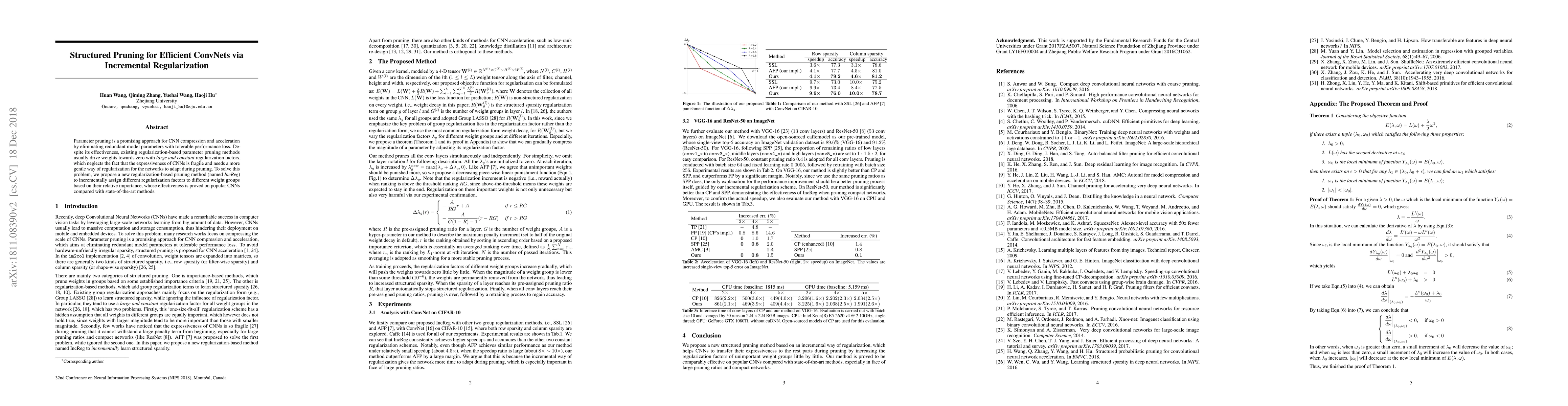 This paper proposes IncReg, a structured pruning method that incrementally assigns varying regularization factors to different weight groups based on their importance, aiming to provide a more gentle regularization during CNN compression. This approach is shown to outperform state-of-the-art methods in maintaining performance while accelerating and compressing convolutional neural networks.