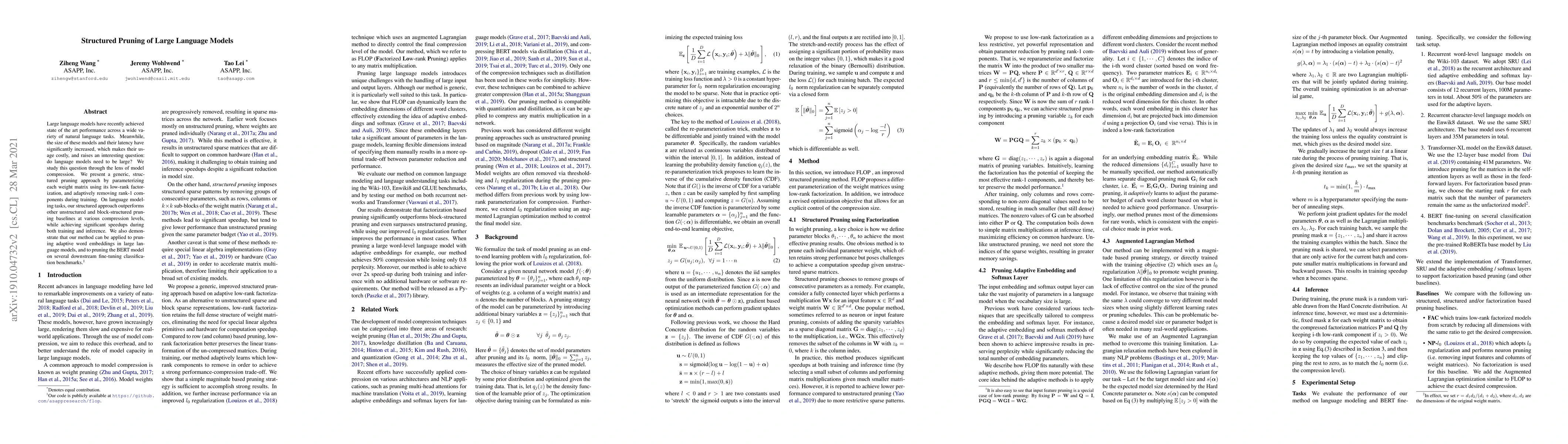 This paper introduces a structured pruning technique for compressing large language models, using low-rank factorization to adaptively remove components. The approach outperforms other pruning methods and achieves significant speedups, while maintaining or improving performance on language modeling tasks and fine-tuning classification benchmarks.