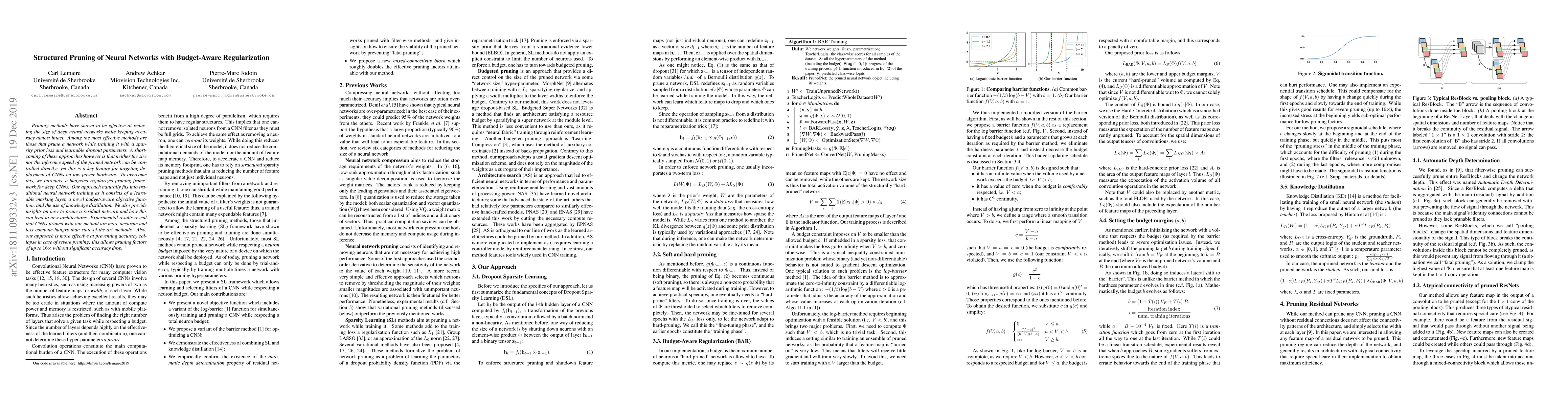 This paper proposes a budgeted regularized pruning framework for deep CNNs that incorporates a learnable masking layer, a novel budget-aware objective function, and knowledge distillation to control network size and inference speed. Experimental results show improved accuracy and efficiency compared to state-of-the-art methods, especially under severe pruning conditions.
