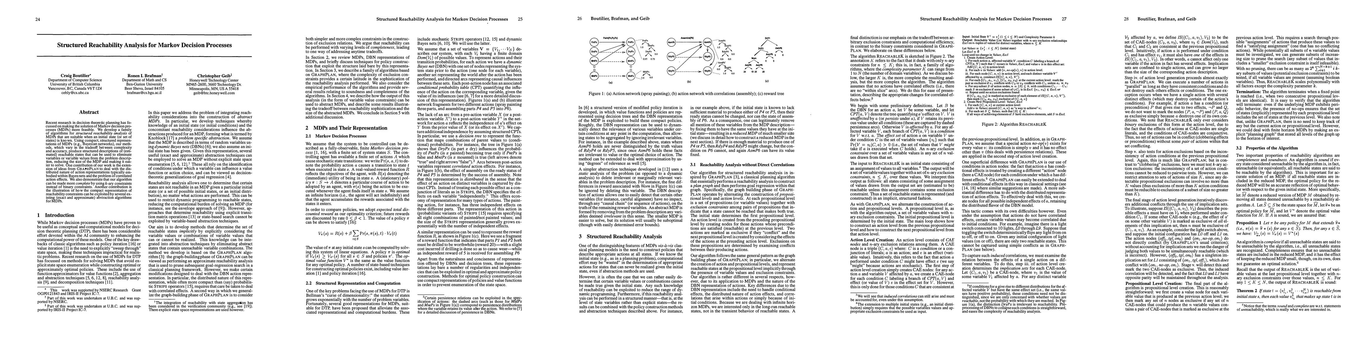 This paper develops algorithms for structured reachability analysis in Markov decision processes (MDPs), utilizing compact representations like Bayesian networks to simplify problem solving. The methods extend GRAPHPLAN ideas to handle distributed actions and correlated effects, and demonstrate improved completeness with k-ary constraints.