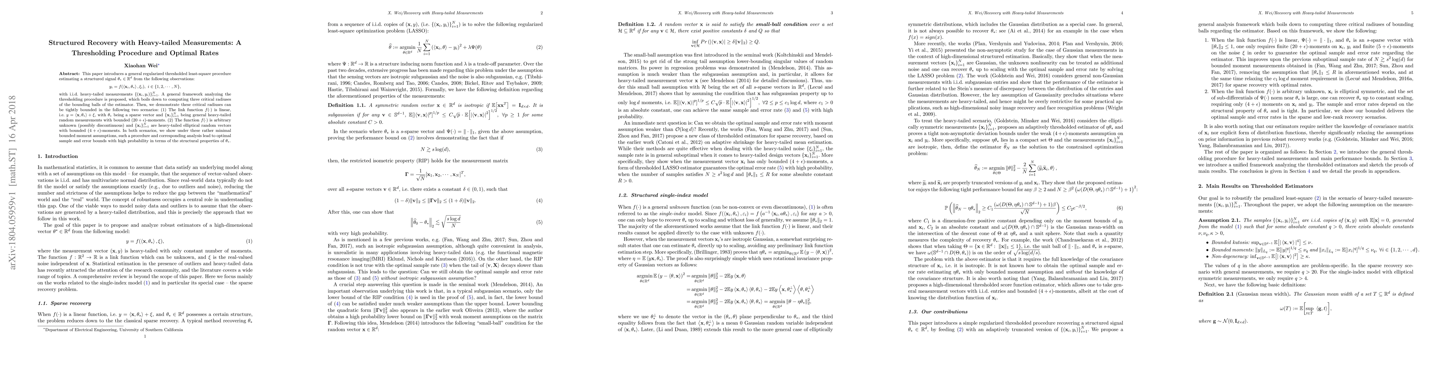 This paper introduces a general regularized thresholded least-square procedure estimating a structured signal $\theta_*\in\mathbb{R}^d$ from the following observations: $y_i = f(\langle\mathbf{x}_i, \theta_*\rangle, \xi_i),~i\in\{1,2,\cdots,N\}$, with i.i.d. heavy-tailed measurements $\{(\mathbf{x}_i,y_i)\}_{i=1}^N$. A general framework analyzing the thresholding procedure is proposed, which boils down to computing three critical radiuses of the bounding balls of the estimator. Then, we demonstrate these critical radiuses can be tightly bounded in the following two scenarios: (1) The link function $f(\cdot)$ is linear, i.e. $y = \langle\mathbf{x},\theta_*\rangle + \xi$, with $\theta_*$ being a sparse vector and $\{\mathbf{x}_i\}_{i=1}^N$ being general heavy-tailed random measurements with bounded $(20+\epsilon)$-moments. (2) The function $f(\cdot)$ is arbitrary unknown (possibly discontinuous) and $\{\mathbf{x}_i\}_{i=1}^N$ are heavy-tailed elliptical random vectors with bounded $(4+\epsilon)$-moments. In both scenarios, we show under these rather minimal bounded moment assumptions, such a procedure and corresponding analysis lead to optimal sample and error bounds with high probability in terms of the structural properties of $\theta_*$.