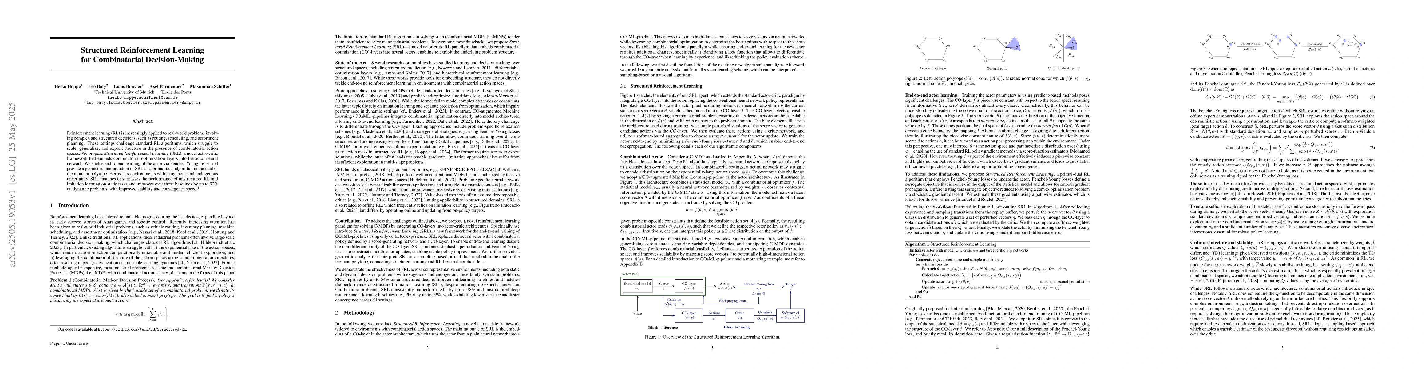 The research proposes Structured Reinforcement Learning (SRL), an actor-critic framework that incorporates combinatorial optimization layers into the actor neural network, enabling end-to-end learning via Fenchel-Young losses and interpreting SRL as a primal-dual algorithm in the moment polytope dual.