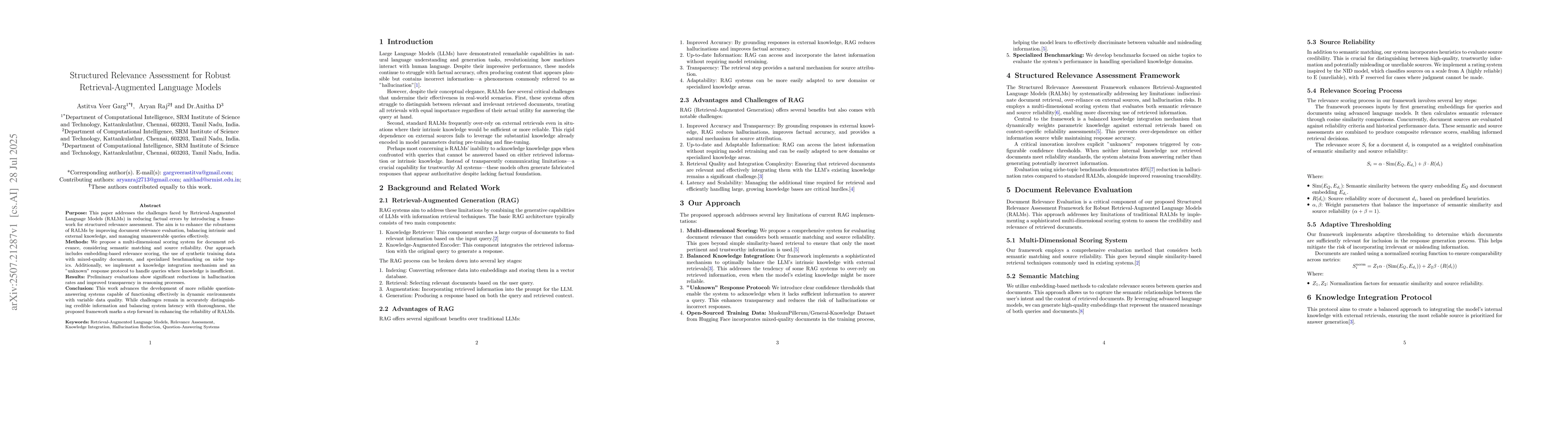 Retrieval-Augmented Language Models (RALMs) face significant challenges in reducing factual errors, particularly in document relevance evaluation and knowledge integration. We introduce a framework for structured relevance assessment that enhances RALM robustness through improved document evaluation, balanced intrinsic and external knowledge integration, and effective handling of unanswerable queries. Our approach employs a multi-dimensional scoring system that considers both semantic matching and source reliability, utilizing embedding-based relevance scoring and synthetic training data with mixed-quality documents. We implement specialized benchmarking on niche topics, a knowledge integration mechanism, and an "unknown" response protocol for queries with insufficient knowledge coverage. Preliminary evaluations demonstrate significant reductions in hallucination rates and improved transparency in reasoning processes. Our framework advances the development of more reliable question-answering systems capable of operating effectively in dynamic environments with variable data quality. While challenges persist in accurately distinguishing credible information and balancing system latency with thoroughness, this work represents a meaningful step toward enhancing RALM reliability.