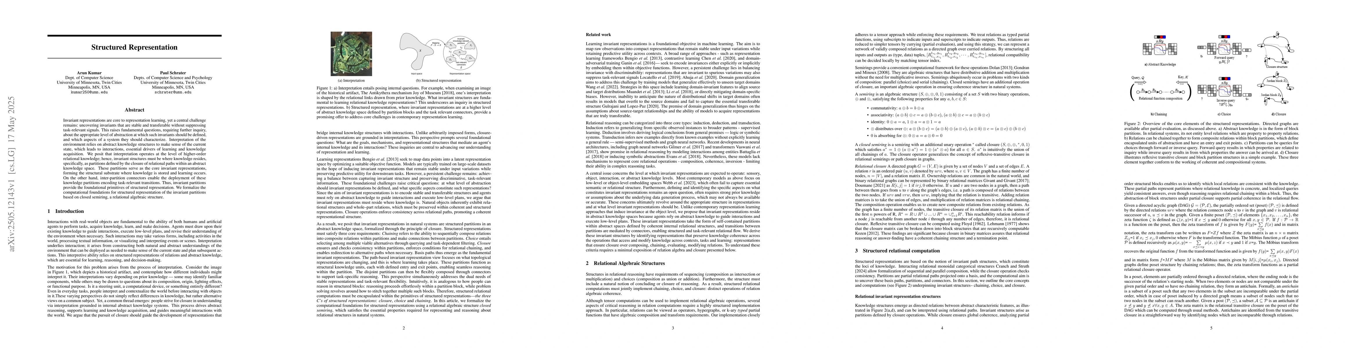 This research paper introduces a new framework for structured representation, proposing that invariant representations reside in abstract knowledge spaces as partitions defined by relational paths. These partitions enable the storage and deployment of task-relevant transitions, forming the foundational primitives of structured representation.