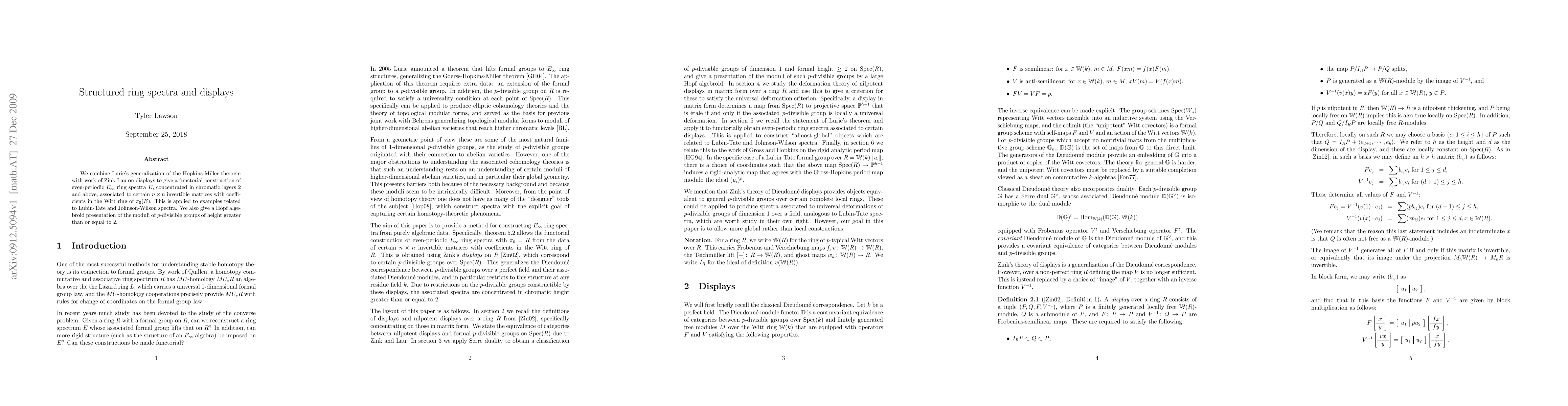We combine Lurie's generalization of the Hopkins-Miller theorem with work of Zink-Lau on displays to give a functorial construction of even-periodic commutative ring spectra, concentrated in chromatic layers 2 and above, associated to certain n by n invertible matrices with coefficients in Witt rings. This is applied to examples related to Lubin-Tate and Johnson-Wilson spectra. We also give a Hopf algebroid presentation of the moduli of p-divisible groups of height greater than or equal to 2.