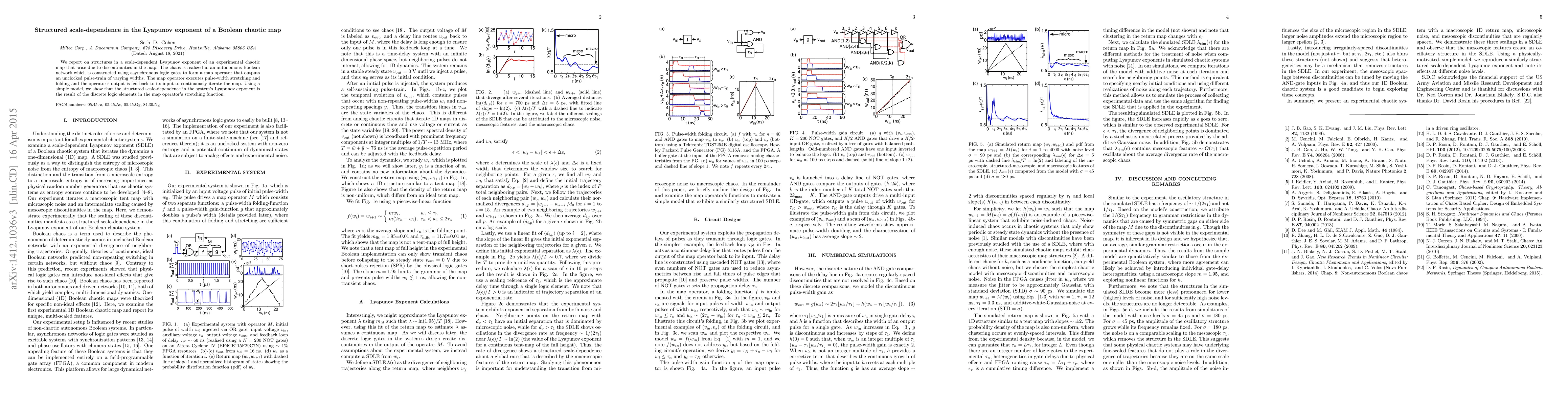 We report on structures in a scale-dependent Lyapunov exponent of an experimental chaotic map that arise due to discontinuities in the map. The chaos is realized in an autonomous Boolean network which is constructed using asynchronous logic gates to form a map operator that outputs an unclocked pulse-train of varying widths. The map operator executes pulse-width stretching and folding and the operator's output is fed back to its input to continuously iterate the map. Using a simple model, we show that the structured scale-dependence in the system's Lyapunov exponent is the result of the discrete logic elements in the map operator's stretching function.