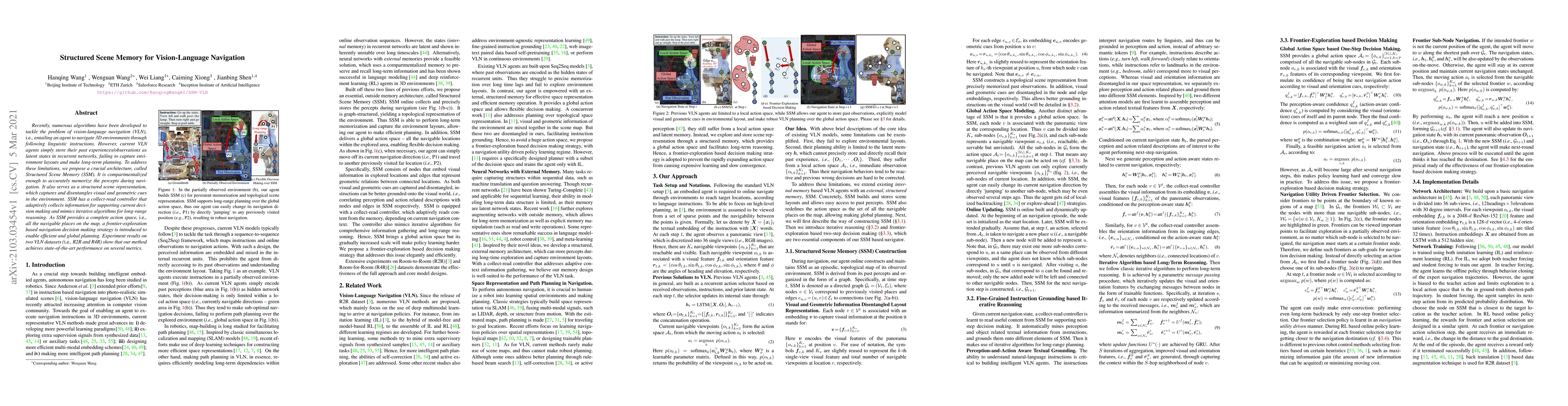 The paper proposes Structured Scene Memory (SSM) to enhance vision-language navigation, addressing the limitations of current VLN agents by providing a structured scene representation that captures visual and geometric cues. SSM's collect-read controller and frontier-exploration strategy enable efficient long-range reasoning and global planning, achieving state-of-the-art results on R2R and R4R datasets.