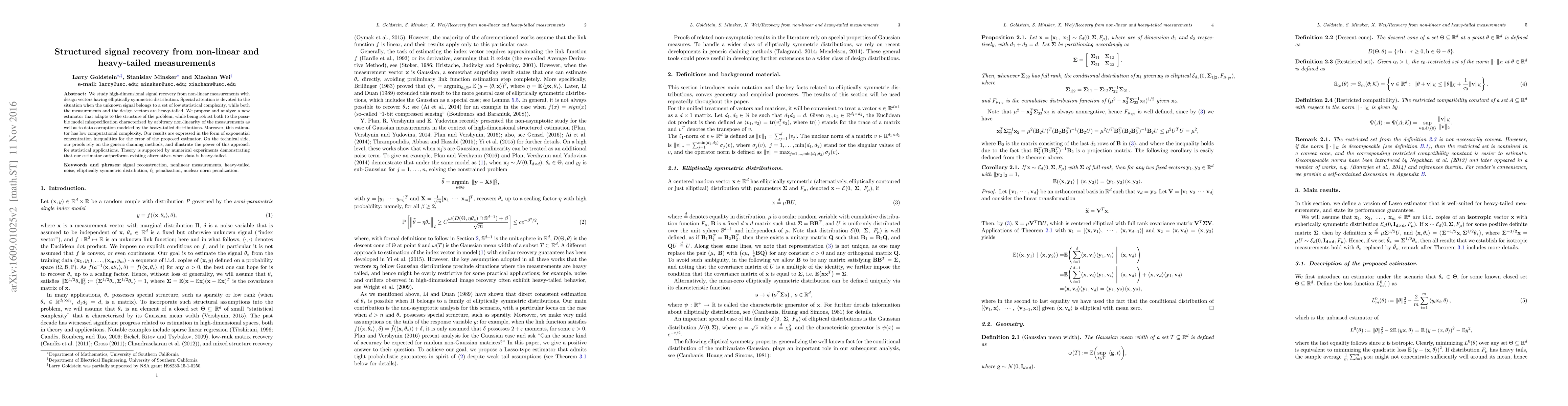This paper proposes a new estimator for high-dimensional signal recovery from non-linear, heavy-tailed measurements, focusing on signals with low statistical complexity. The estimator is robust to model misspecification and data corruption, and is shown to outperform existing methods through numerical experiments.
