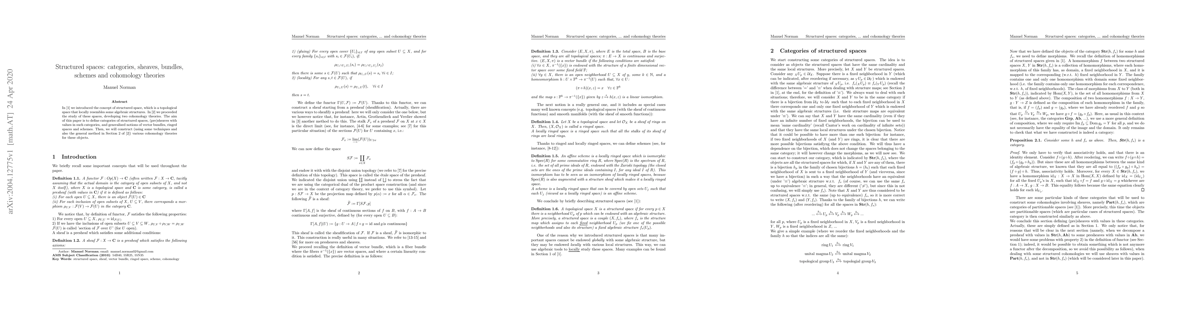 This paper develops a framework for structured spaces, including categories, sheaves, bundles, schemes, and cohomology theories, providing a unified approach to algebraic and topological structures.