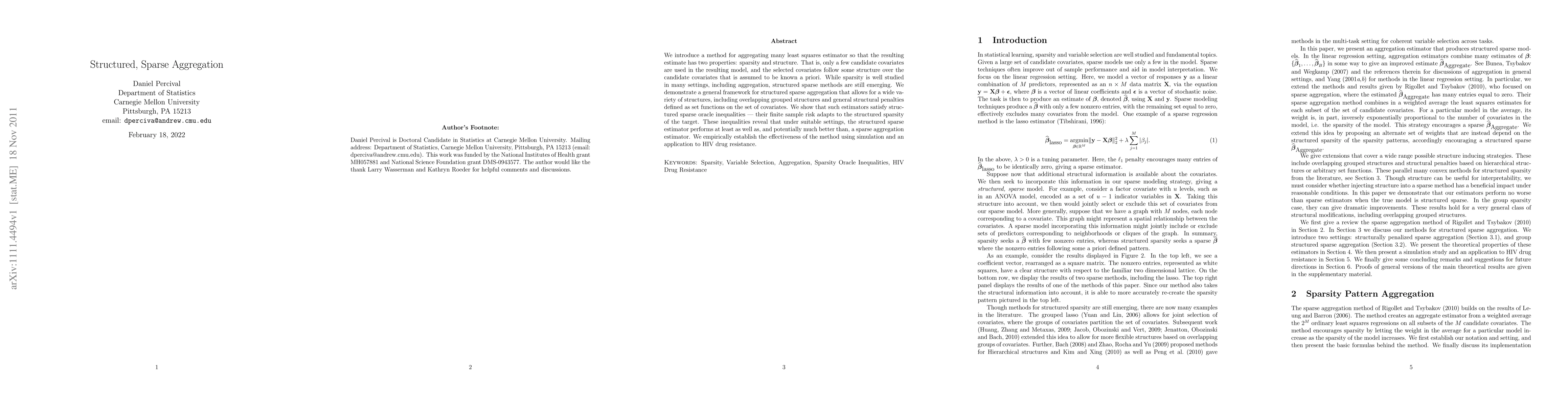 This paper introduces a structured sparse aggregation method for least squares estimators that ensures both sparsity and predefined covariate structure. The method demonstrates superior performance compared to traditional sparse aggregation, validated through simulations and an application to HIV drug resistance.